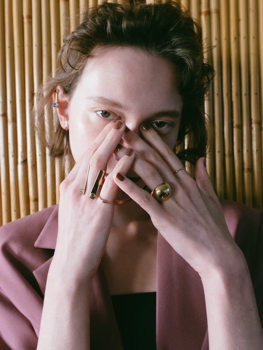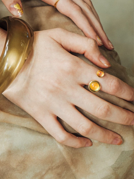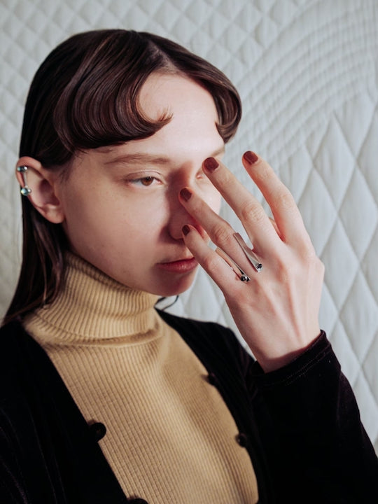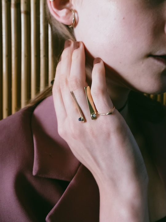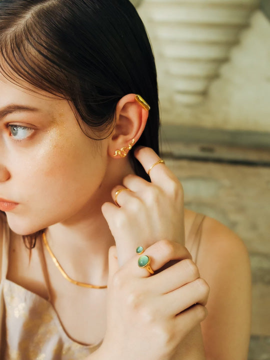 2つの異なる大きさのガラスを埋めこみ、指を優しく包み込むようなデザインに。植物や蔓を連想させるようなユニークなシルエット。異なる大きさのモチーフながらも指の周りを沿わせる柔らかな印象に。他に類を見ない一品です。