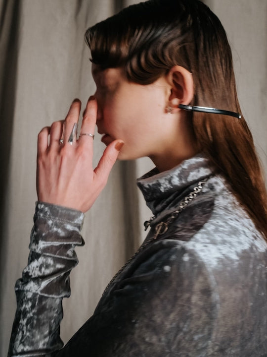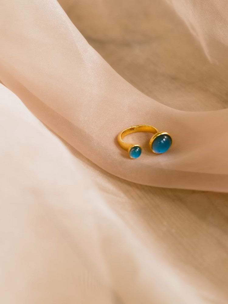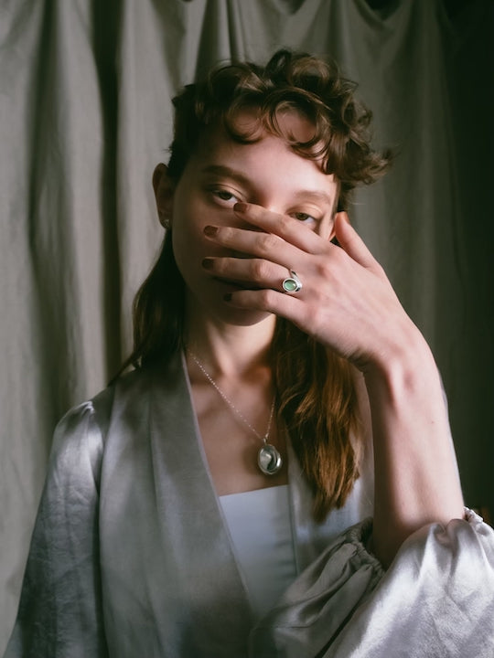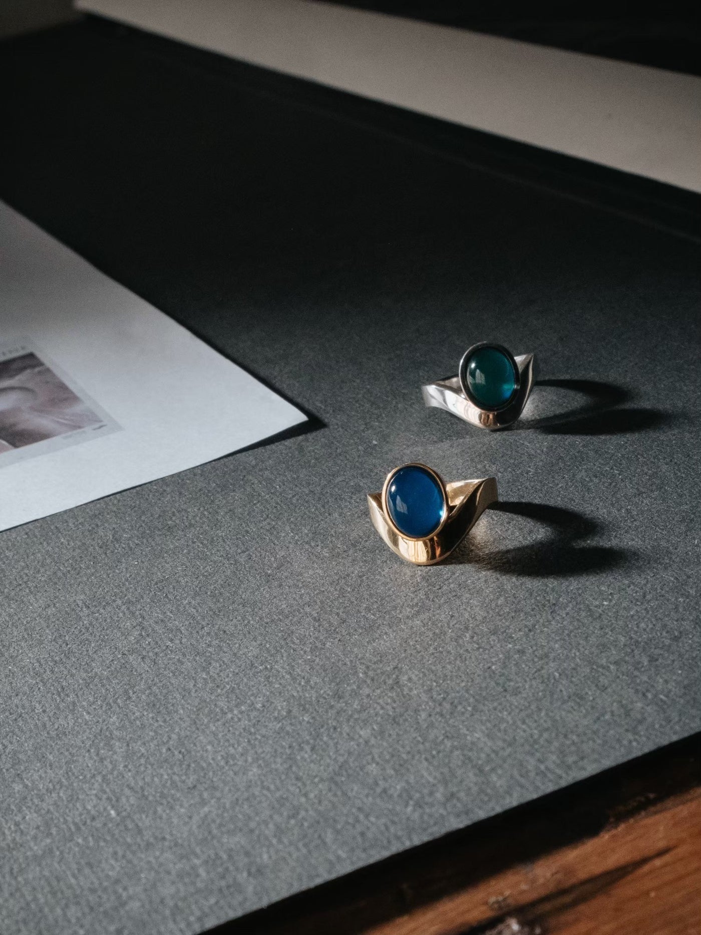 大きく波打つシルバーの中に存在感のあるムードガラスを。アールデコを彷彿とさせるデザインはメインリングとしてはもちろん、華奢な指にはめれば女性らしい縁の曲線がより目立ってきます。