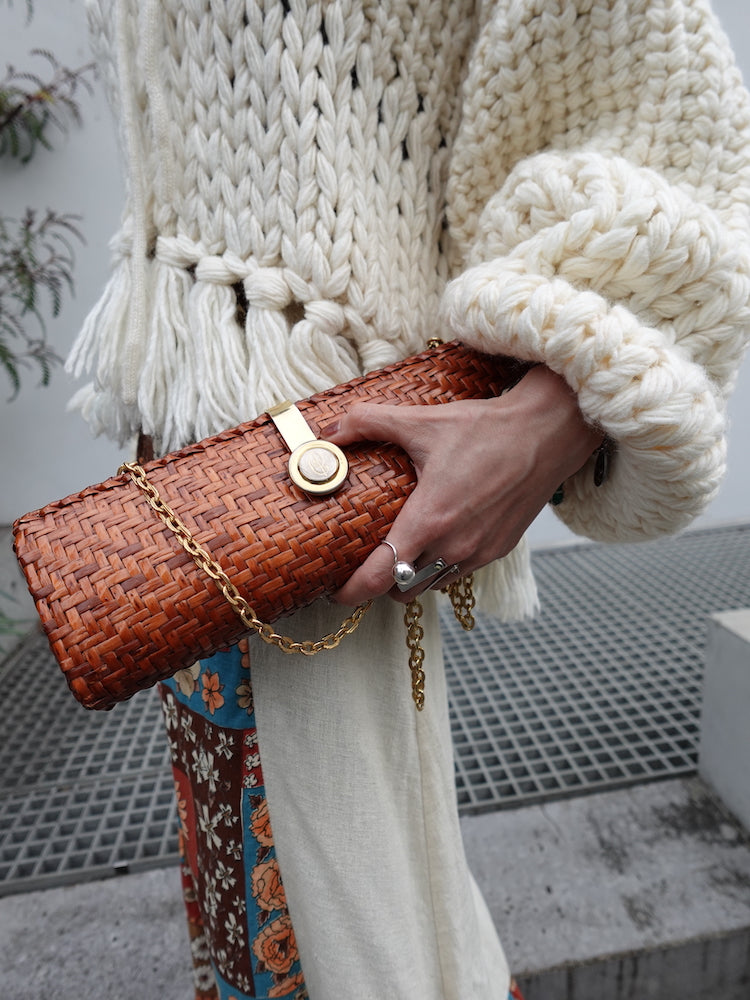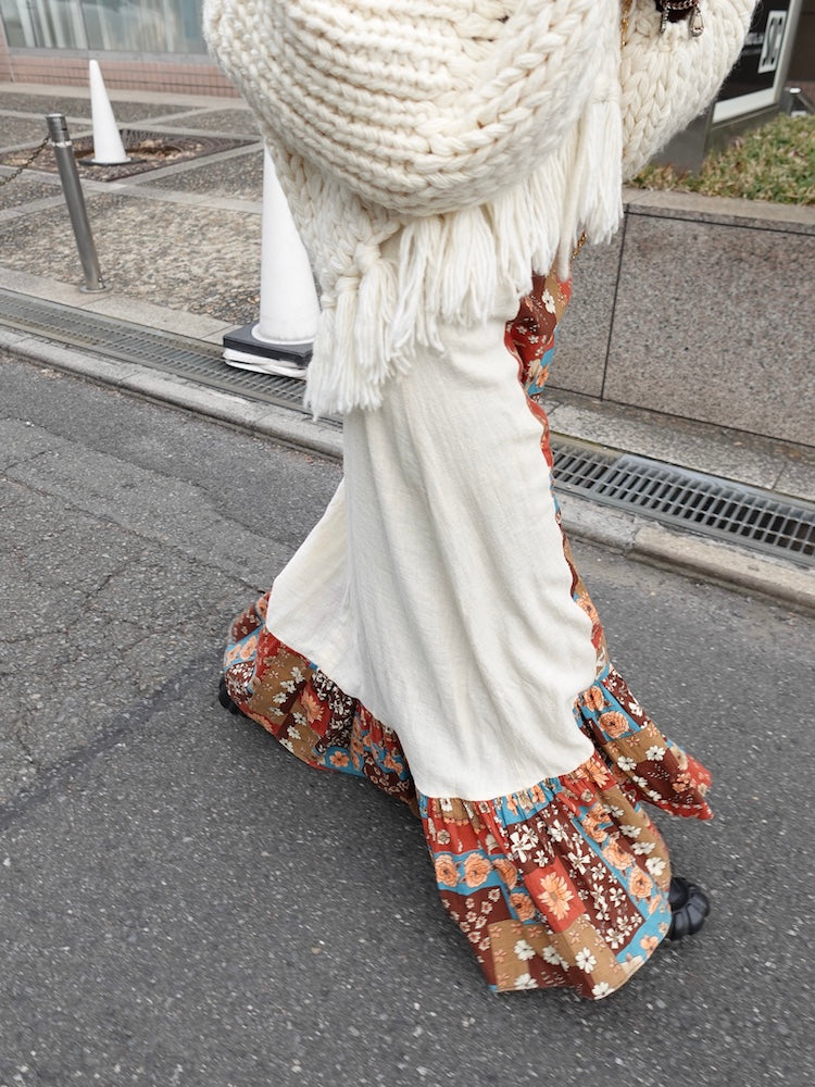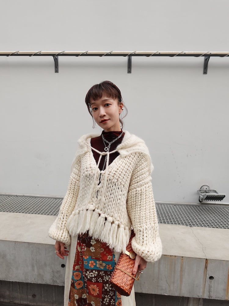 「フリンジカーディガンをメインに、ヴィンテージアイテムと合わせてみました。花模様スカートと籠バッグを合わせて、オールディーな空気感にしてみました。首元が寂しかったので、ELLA CANTARIAのKid Mohair Knit Hoodie をあわせてアレンジしてみました。」