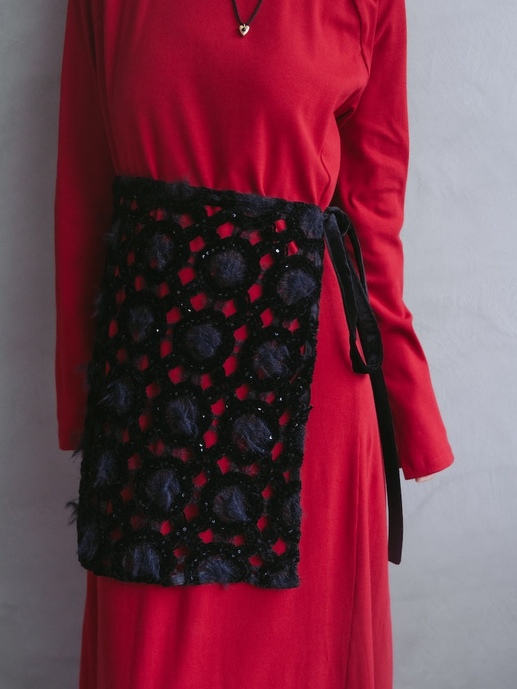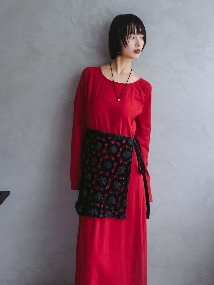 ふわふわとした立体的なテクスチャーが印象的で、秋冬のスタイリングにぴったり。リボンで結ぶタイプなのでウエスト調整もしやすく、太もも中間くらいの丈感でバランスが取りやすいです。繊細な素材なので引っかけには少し注意が必要だなと思いました。