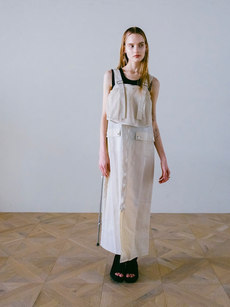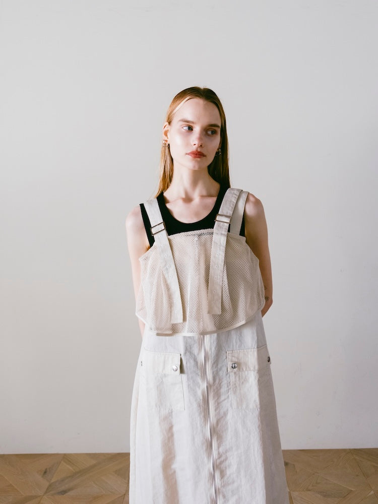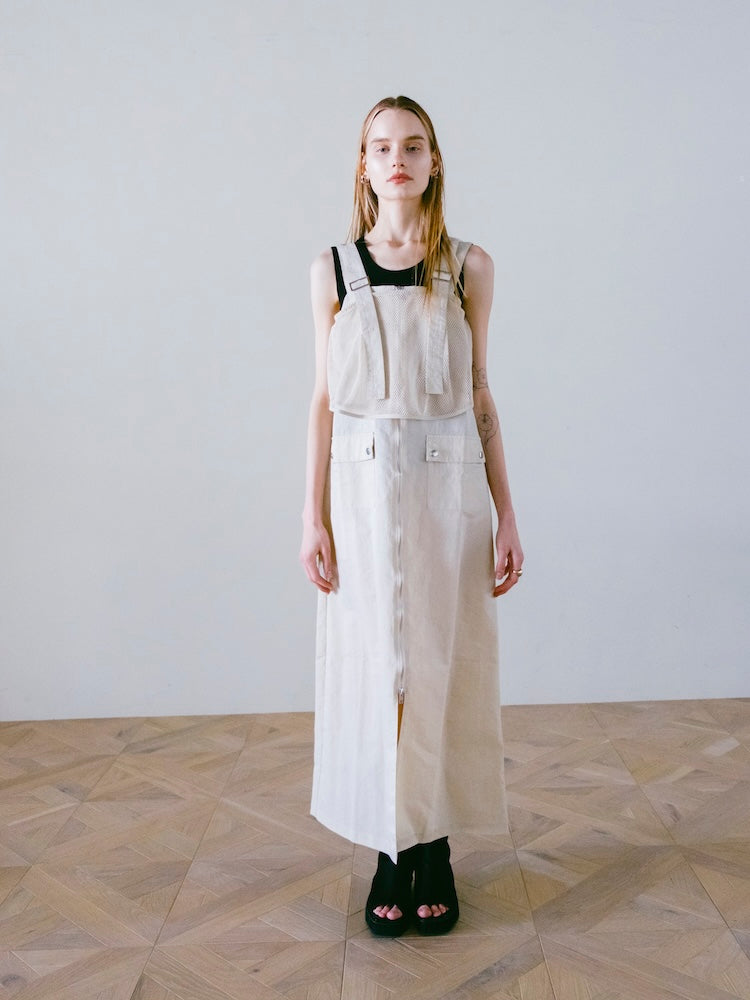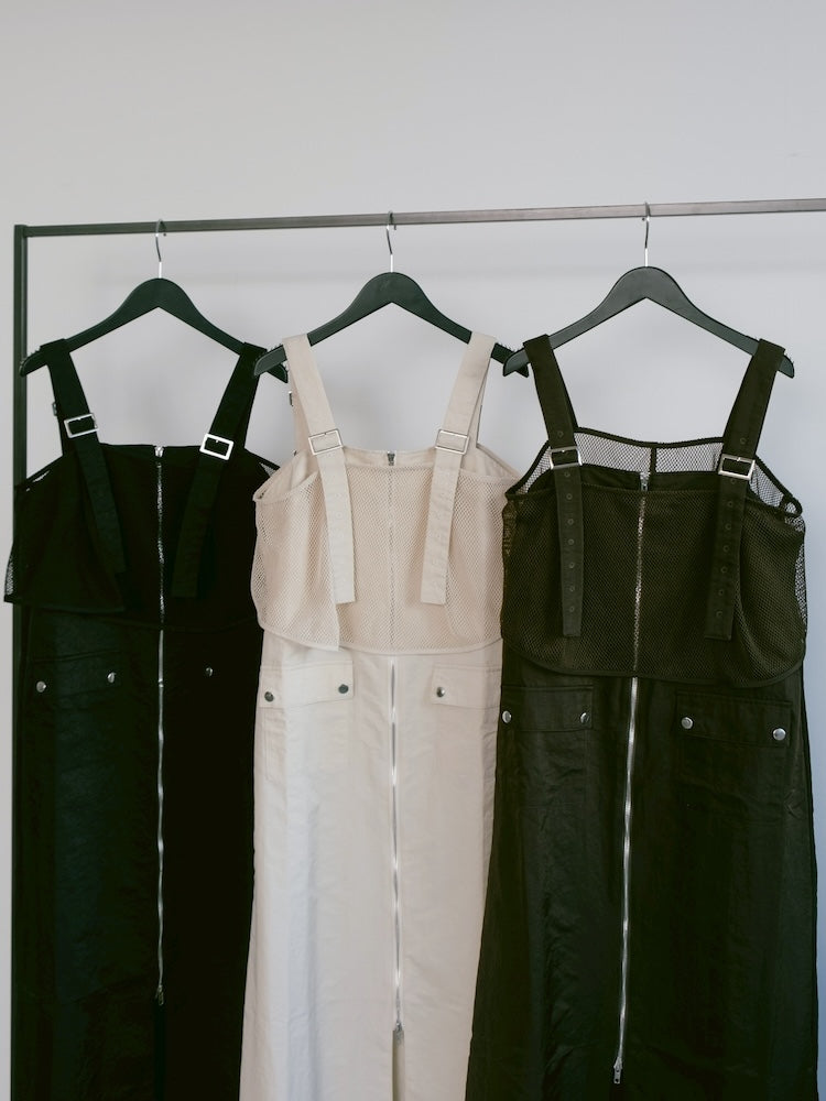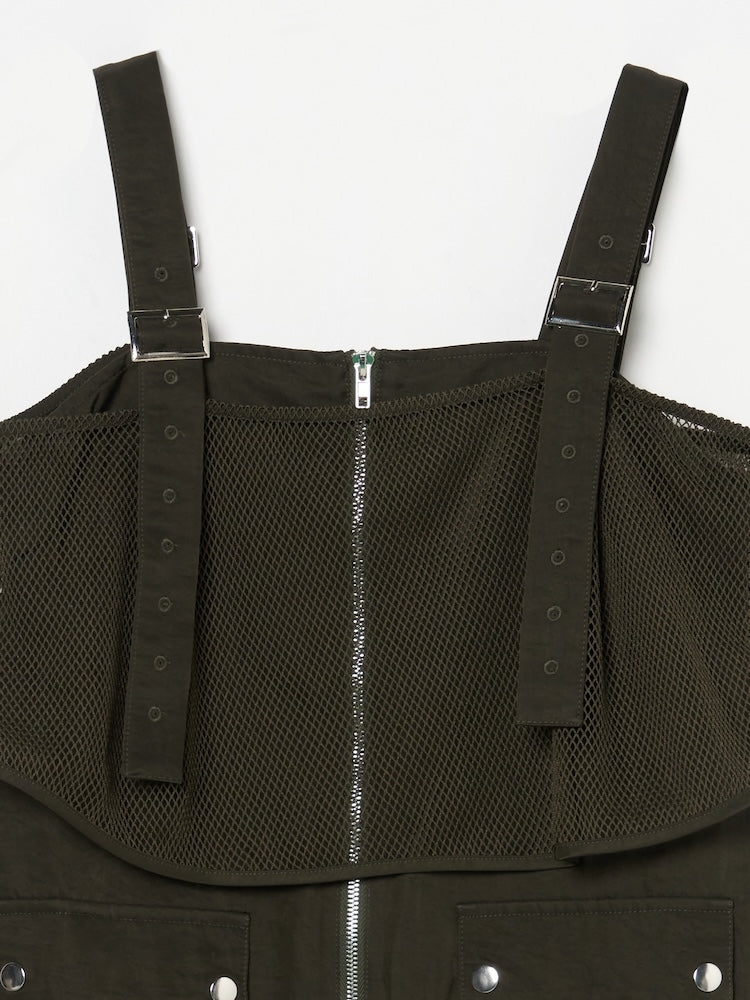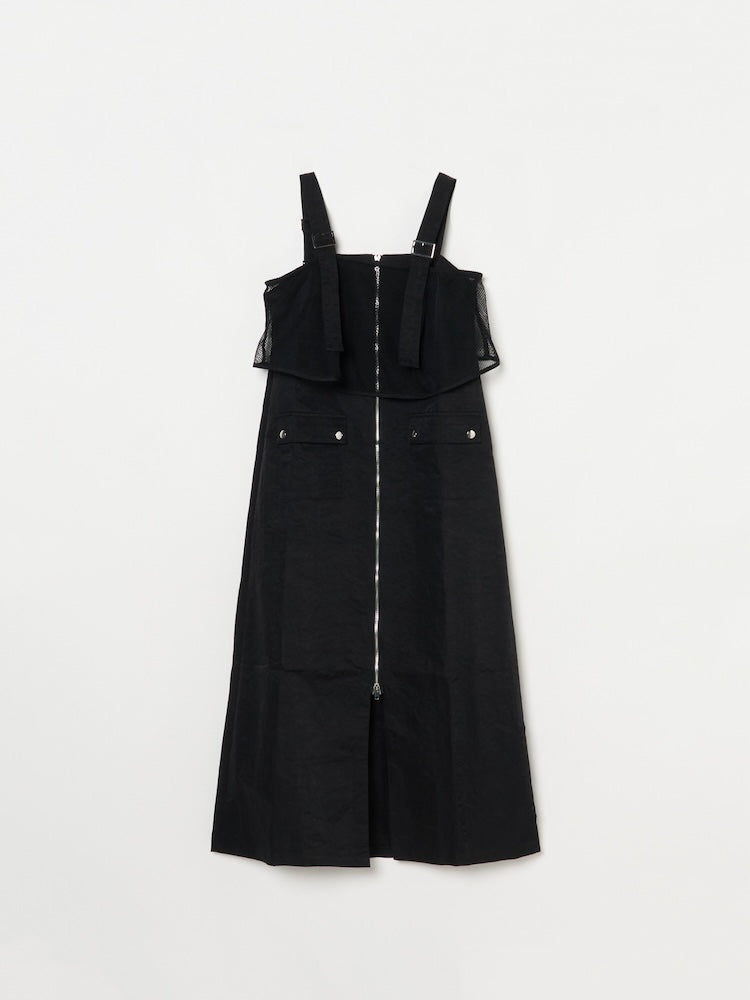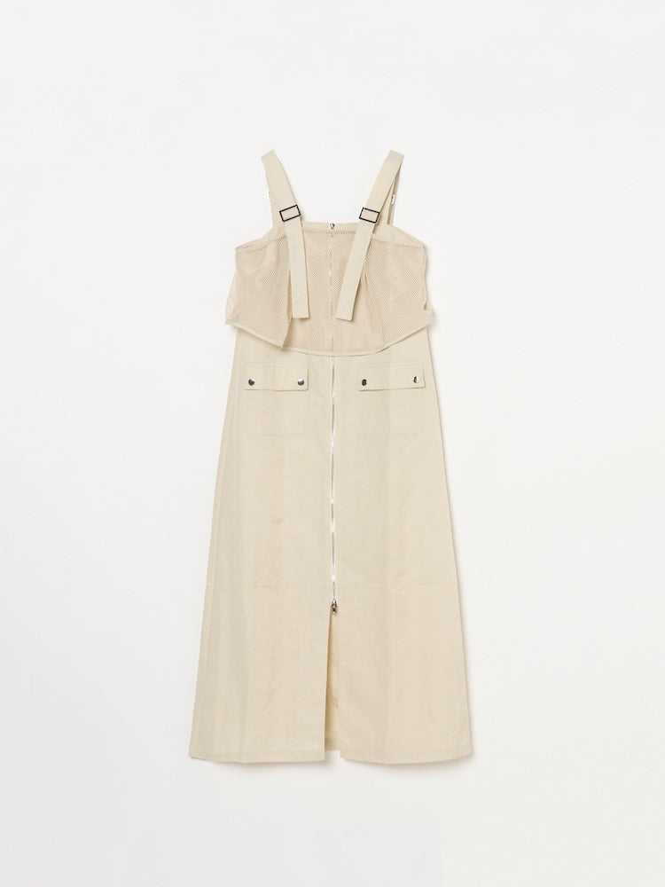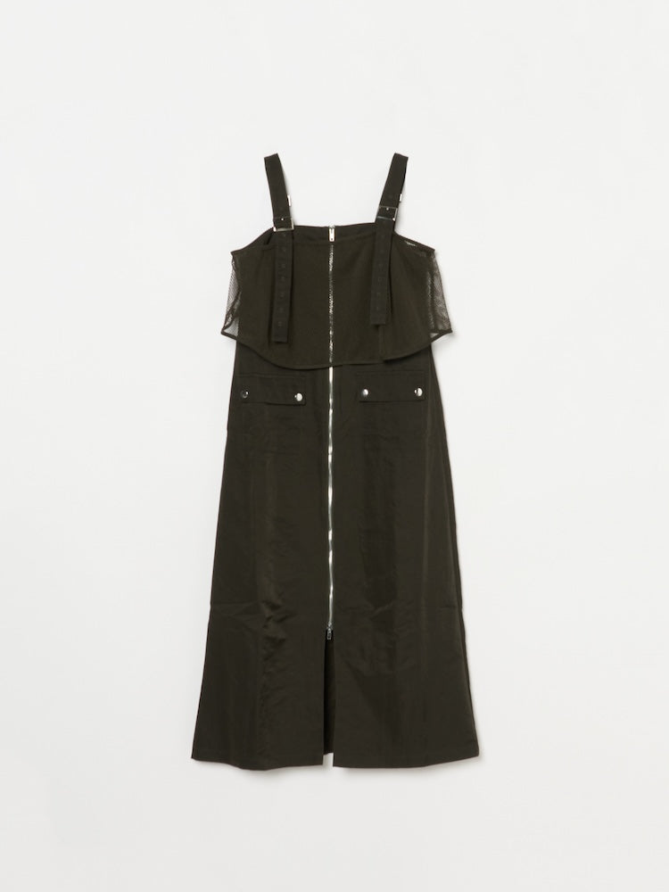 メッシュ素材のデザイントップと、ナイロン素材のジップワンピースを組み合わせた、汎用性の高い2wayワンピース。