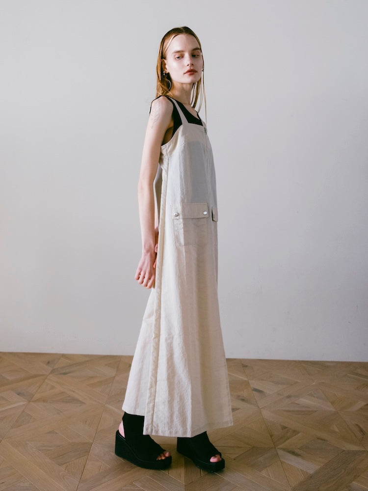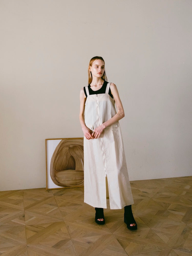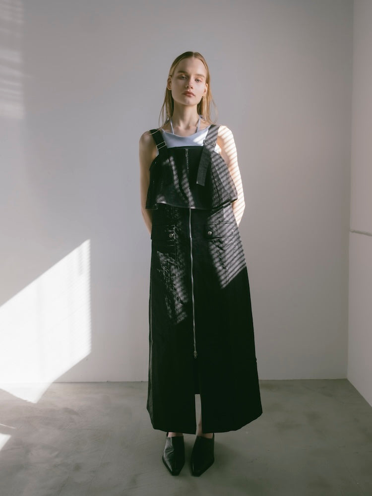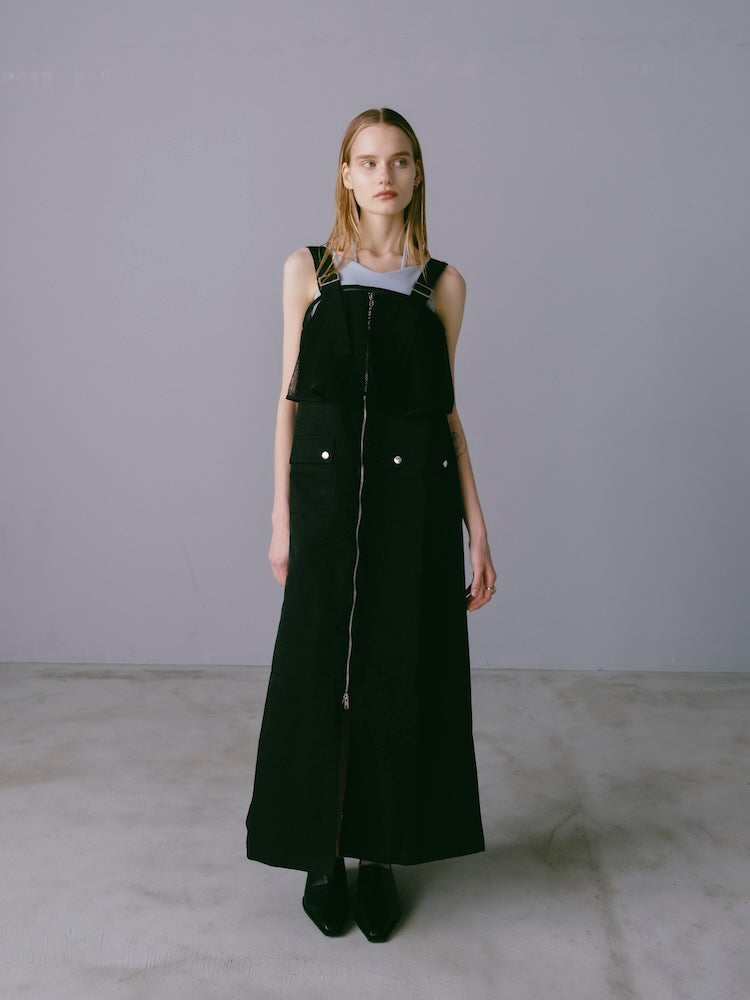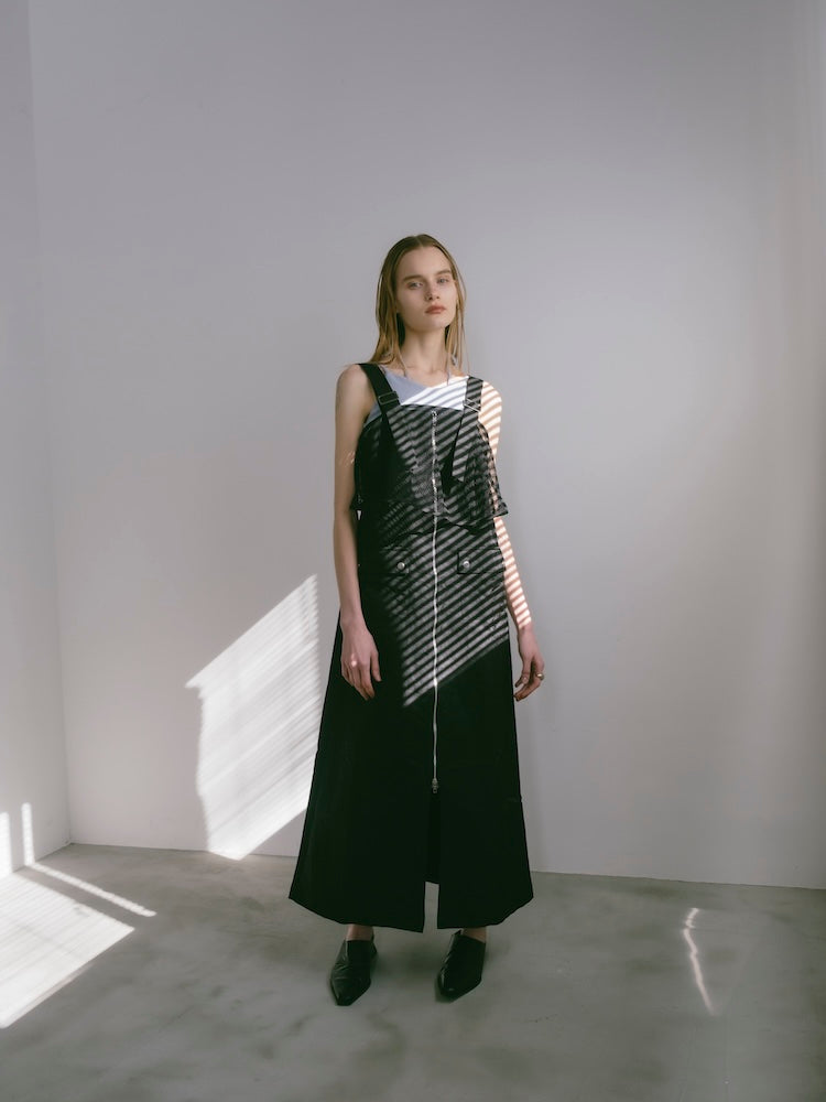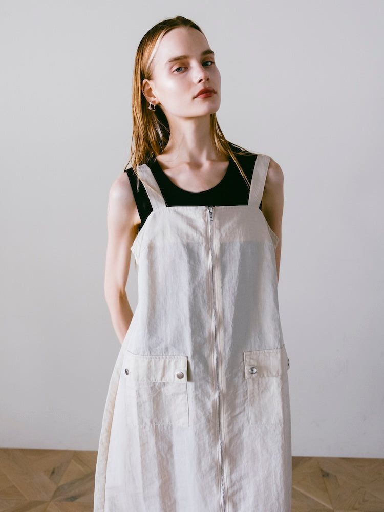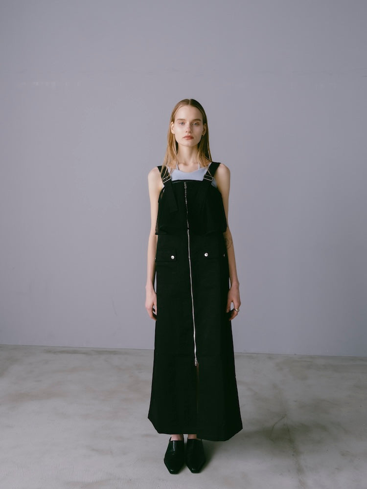 ワンピースはフロントジップ仕様で、縦のラインを強調し、すっきりとしたシルエットを演出します。
