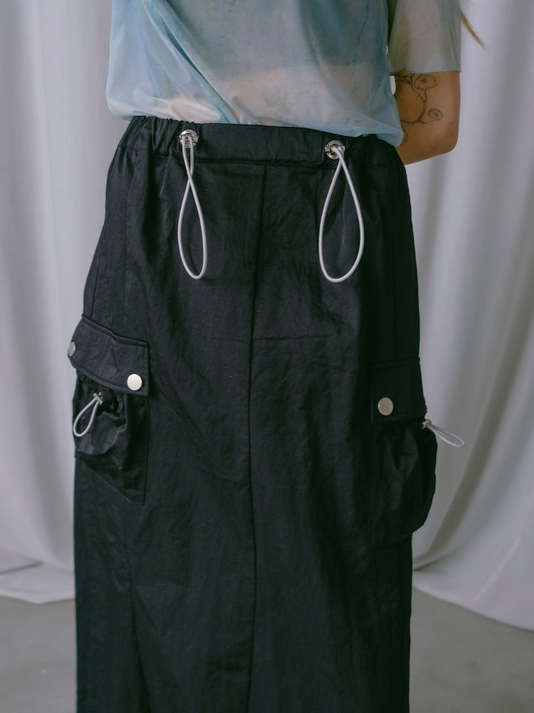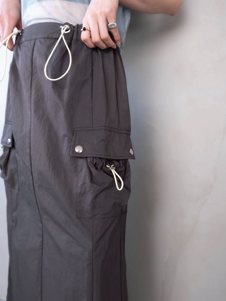 シャカシャカした水に強いナイロン生地。裾のファスナーを開ければフレアシルエットに。
