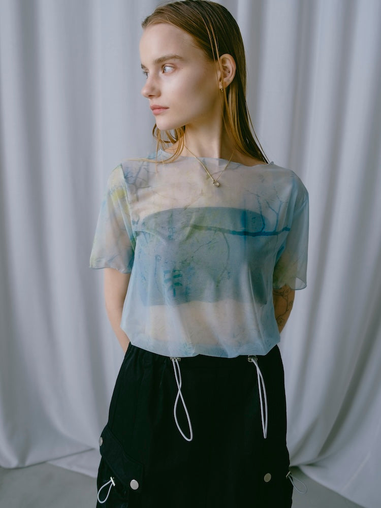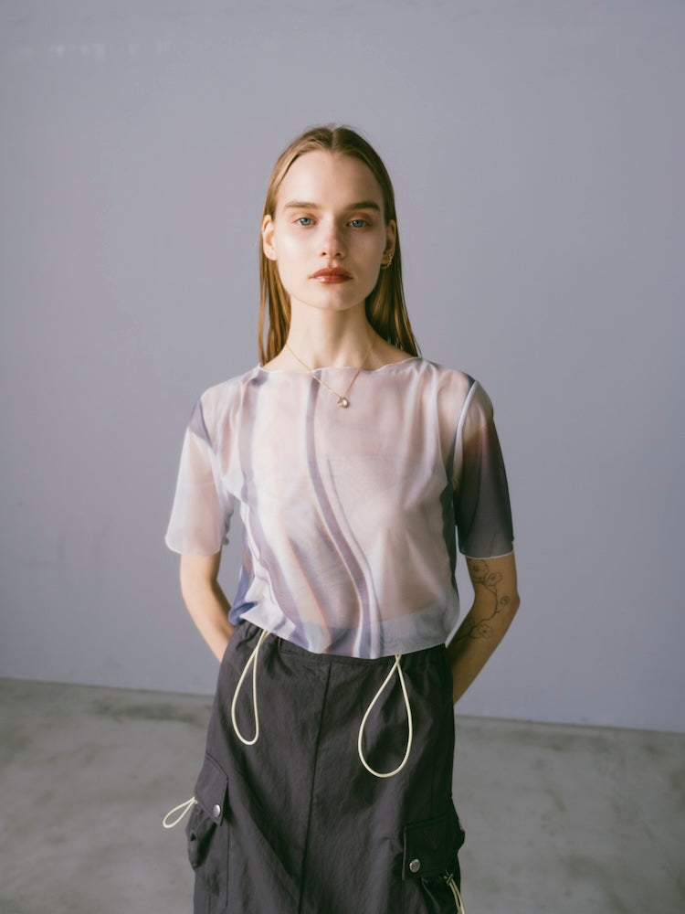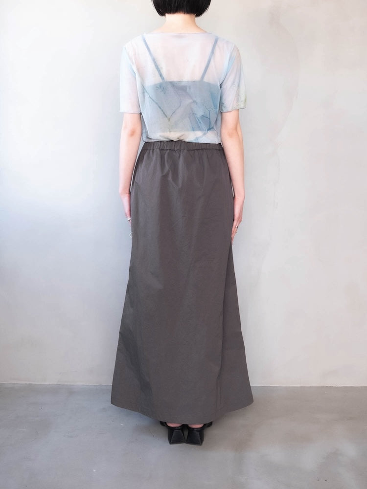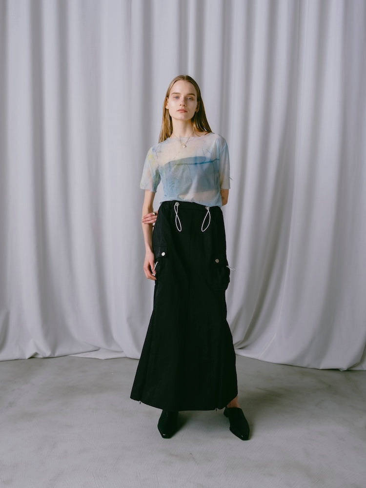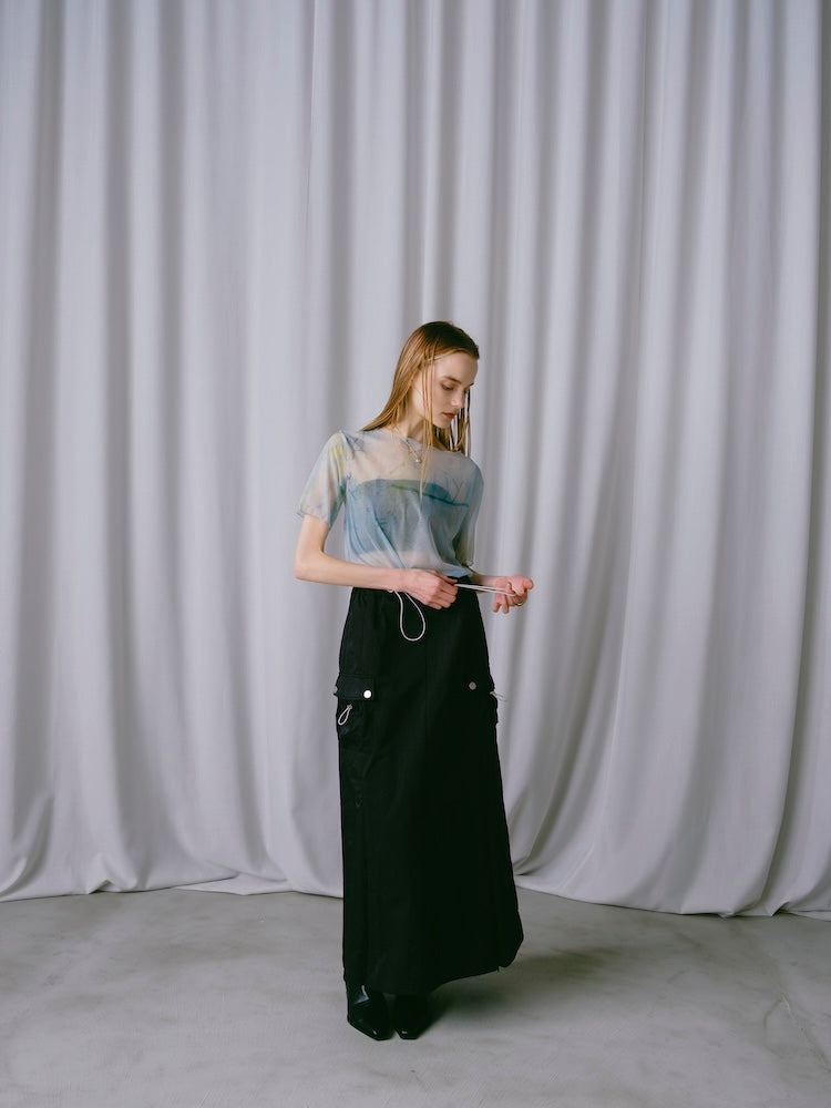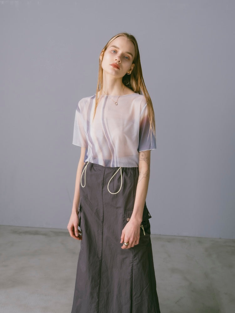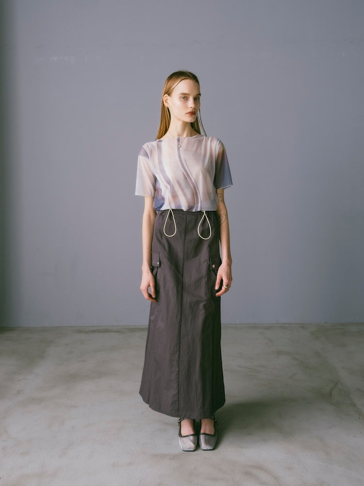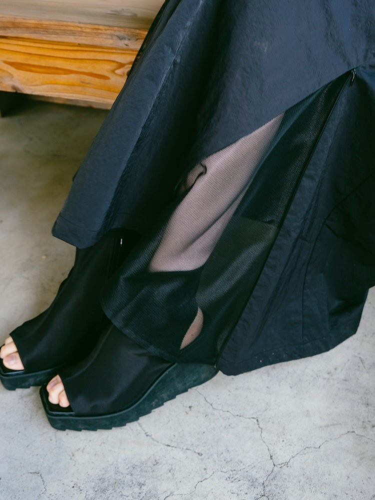 裾部分にはジップを配し、開閉することでメッシュ素材が現れるデザイン。ジップを閉じればすっきりとしたラインに、開ければフレアシルエットへと変化し、スタイリングに軽やかな動きをもたらします。