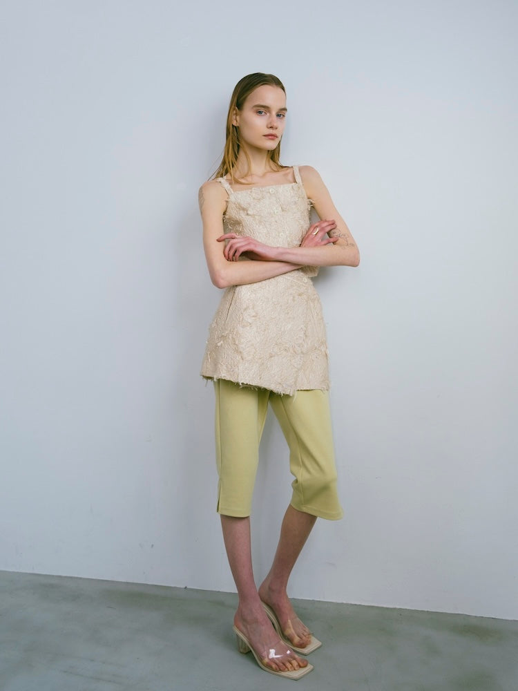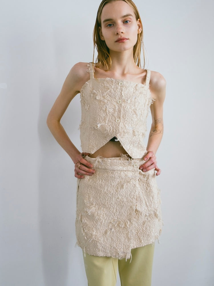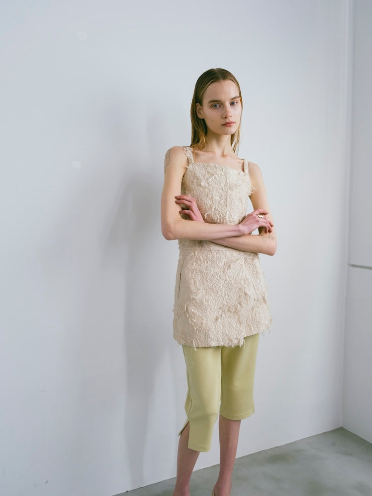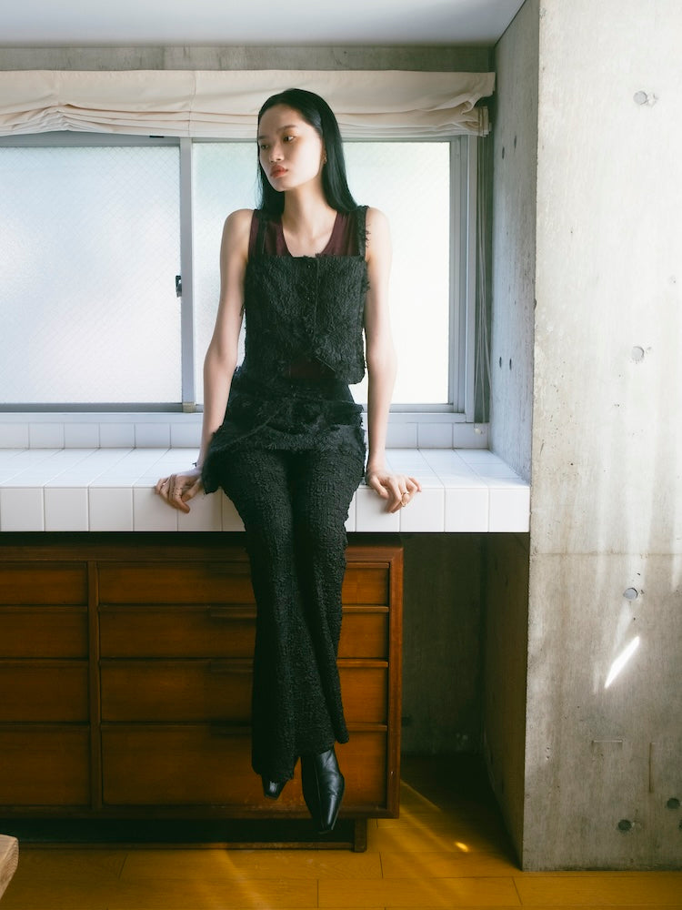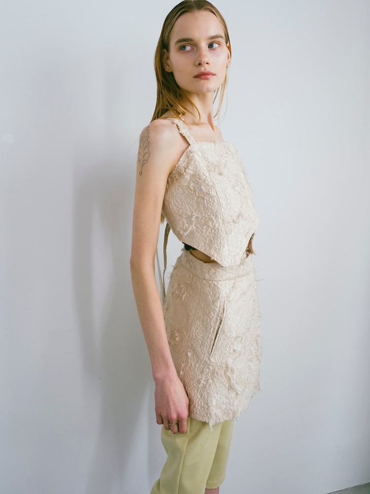 ビスチェは背中でサイズの調整が可能で、レイヤードすることでスタイルにアクセントをプラス。素材の表情と構築的なデザインが調和した一着です。