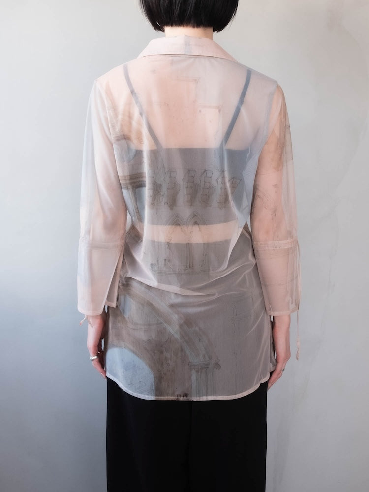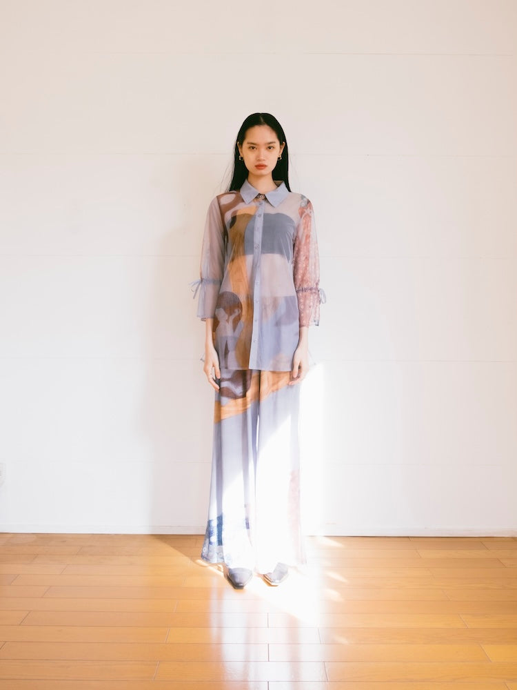 腰回りをカバーする安心感のある着丈で日常にも重宝し、肘にはギャザーが施されているのでお好みでシルエットを変えられる一着。 Art Print Sheer Pants とセットアップで合わせれば統一感のあるスタイリングに、単品ではコーディネートの主役として。日常にアートの余韻を添える一着です。