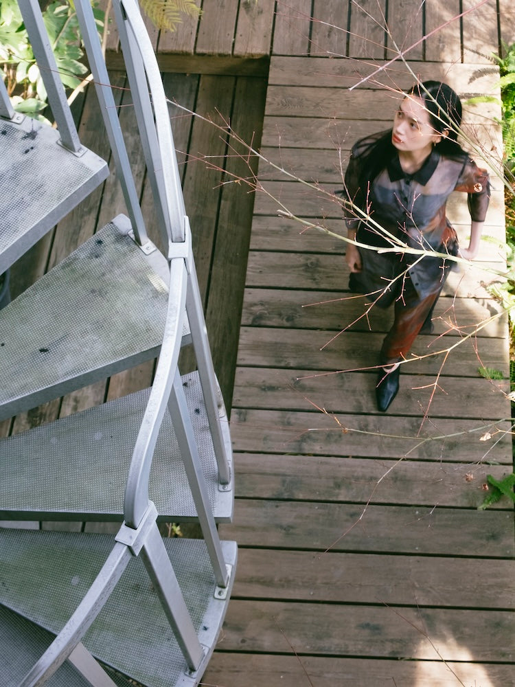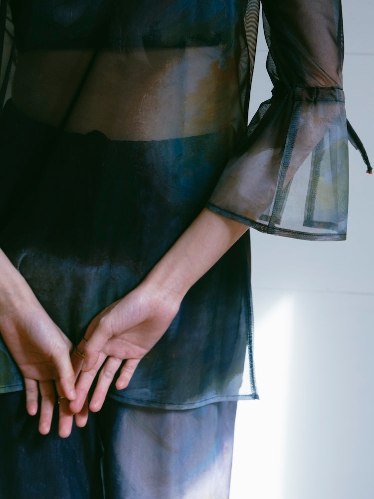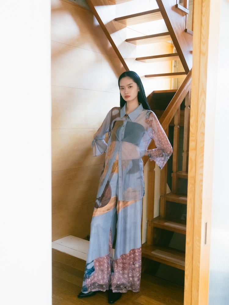 色彩の重なりや筆致のニュアンスをそのまま写し取った柄が、透け感のある素材と溶け合い、アートピースのような奥行きのある表情を描き出します。