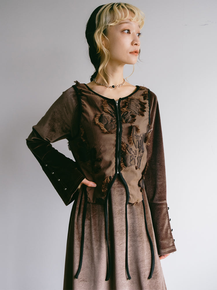 表情豊かなカットジャガード生地のベストが印象的な、レイヤードベロアドレス。