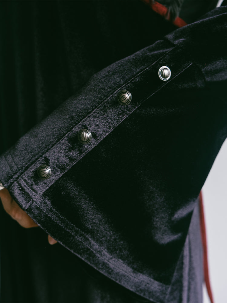 袖口へ向かって広がるフレアスリーブにはコンチョボタンをあしらい、どこか異国の香りを感じさせる、クラシカルでモダンなムードが漂う一着です。