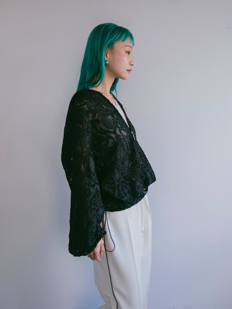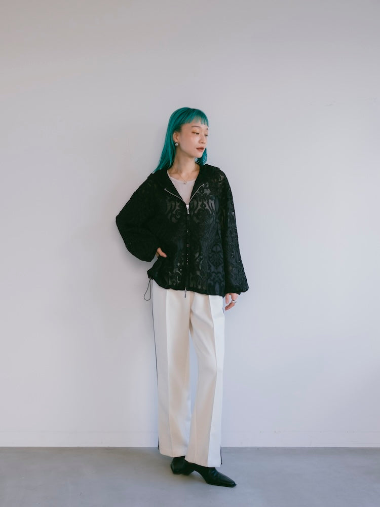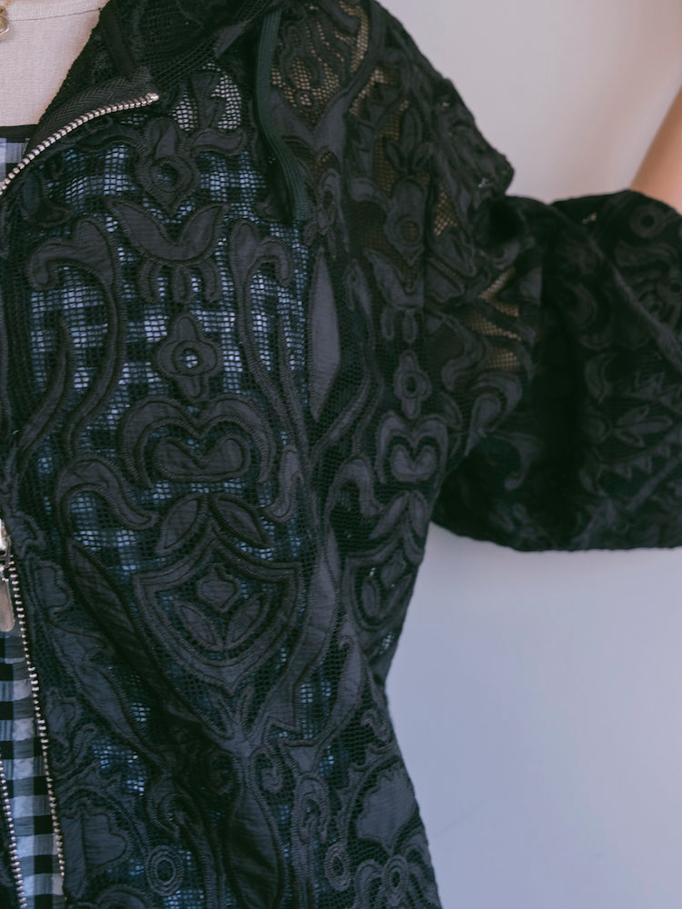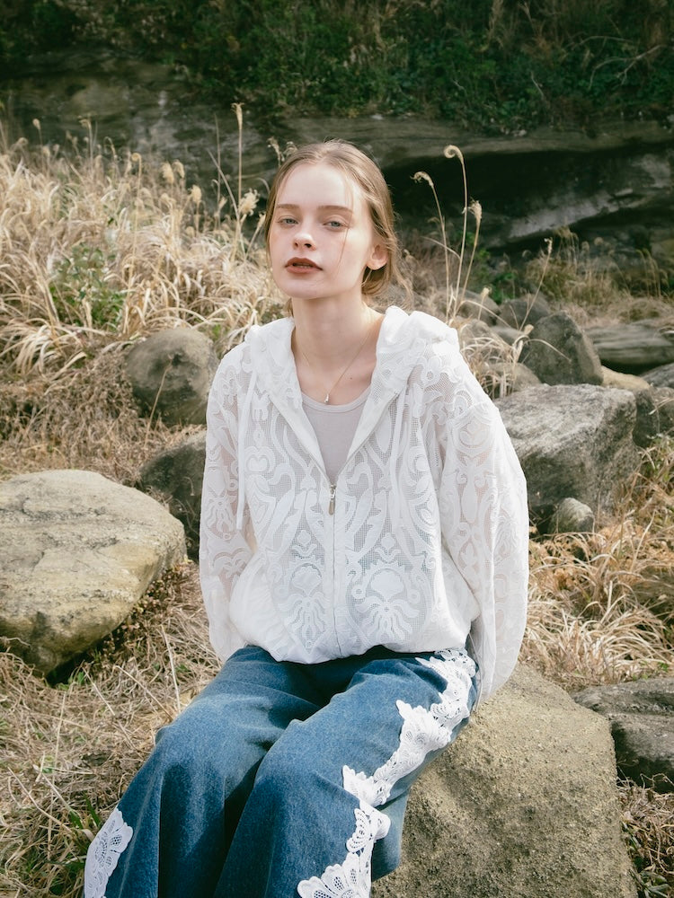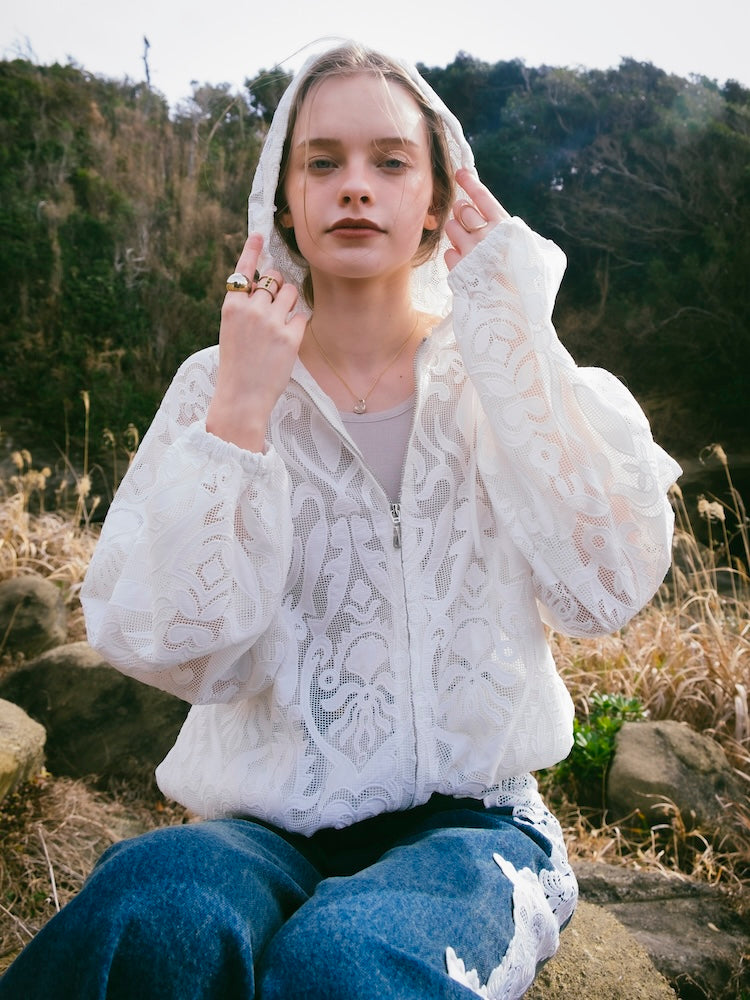 繊細で立体感のあるオーナメント調のレースが印象的なジップアップフーディー。
