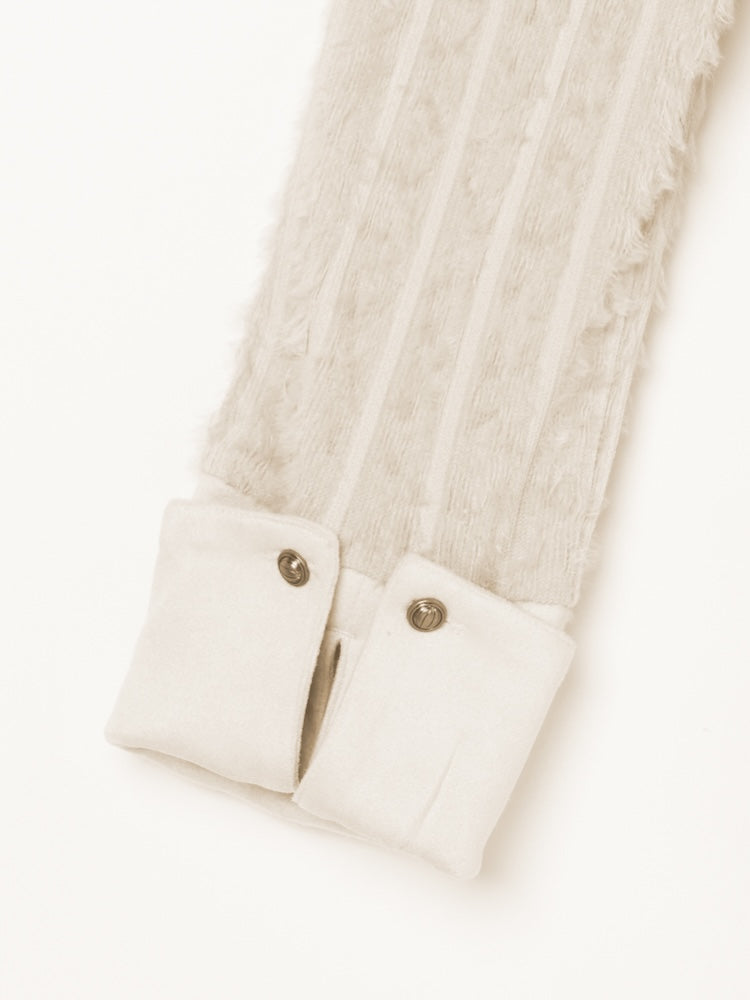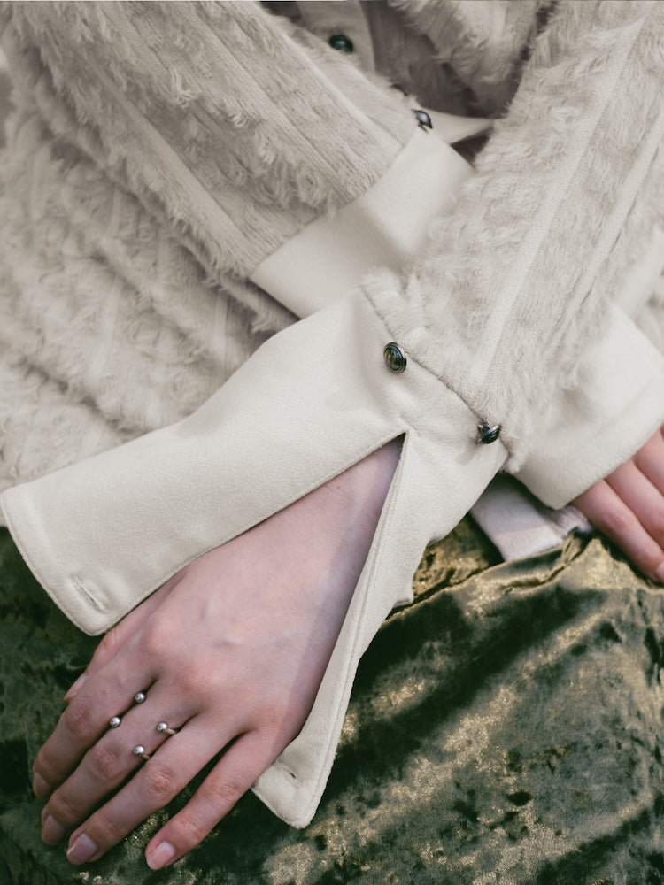 袖口にはスリットとコンチョボタンを施し、折り返して留めることも可能。スタイリングの幅を広げ、シーズンを越えて長く楽しめる一着です。