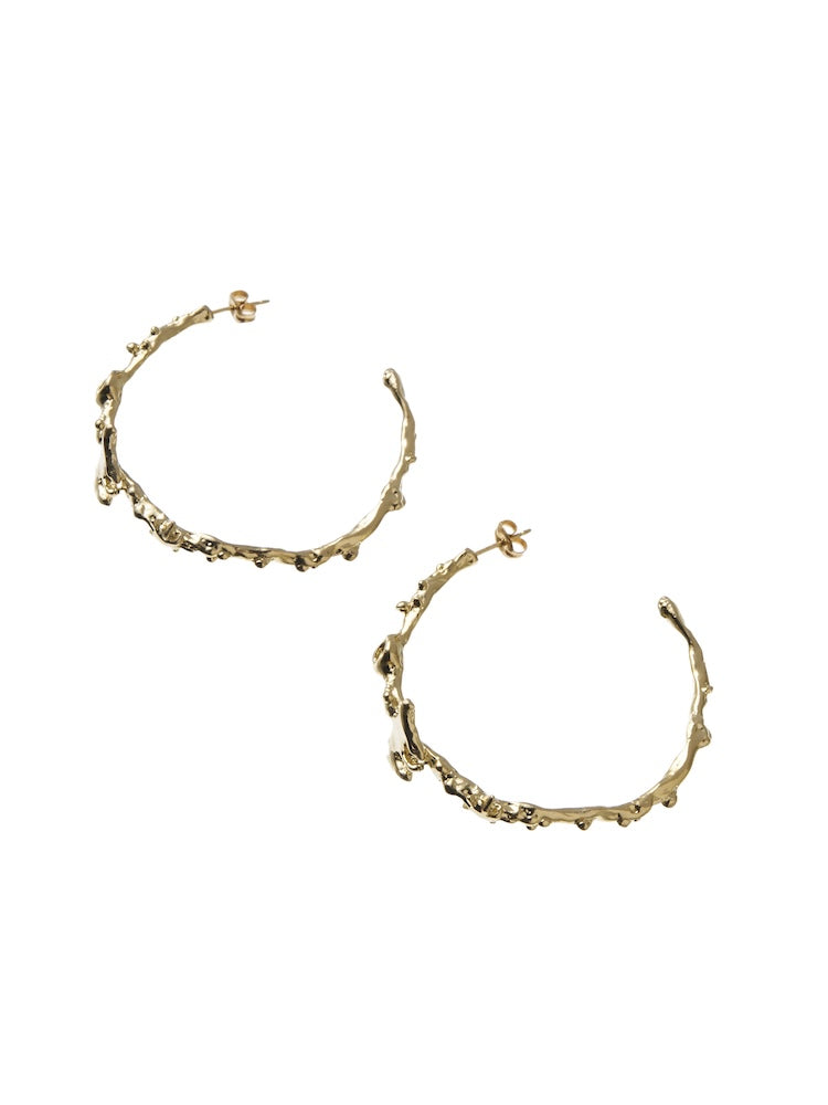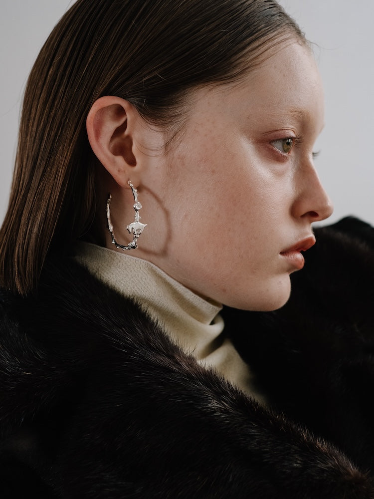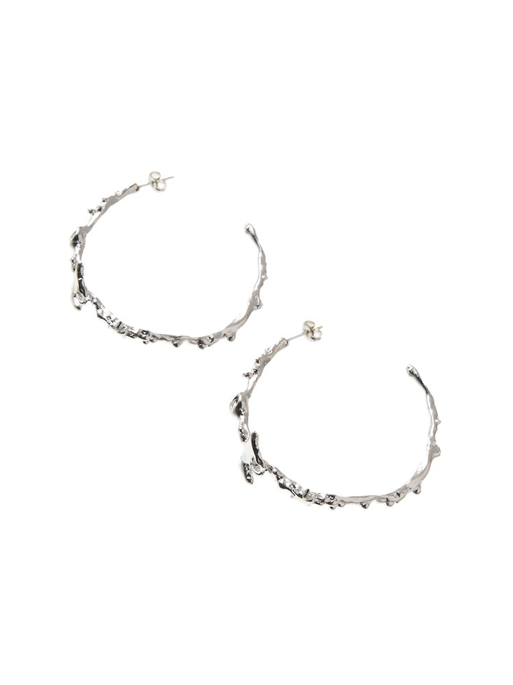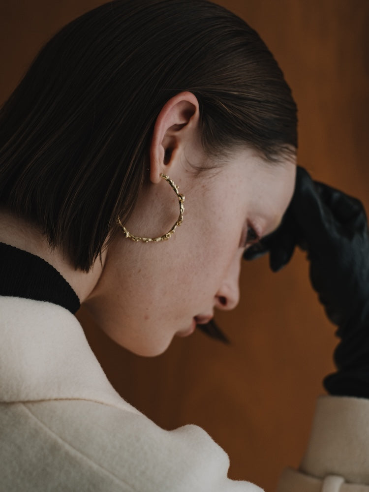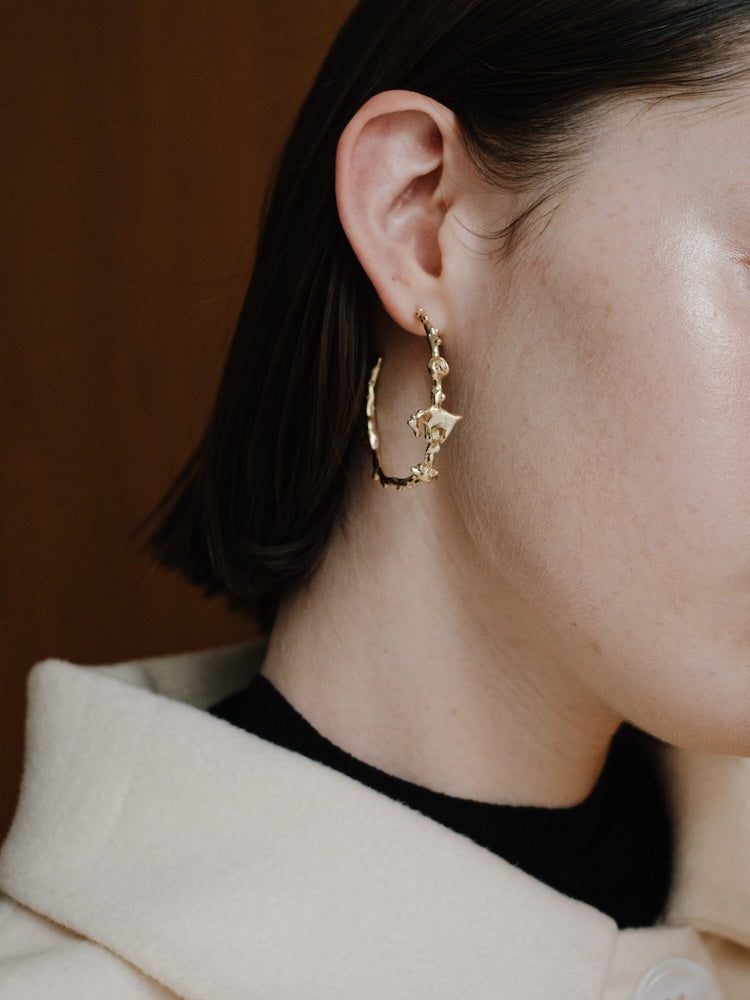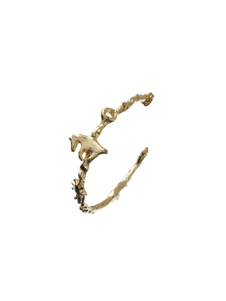 古代のテクスチャーを纏ったフープに、太陽、星、そして馬のモチーフを刻んだアンシエントな印象のフープピアス。