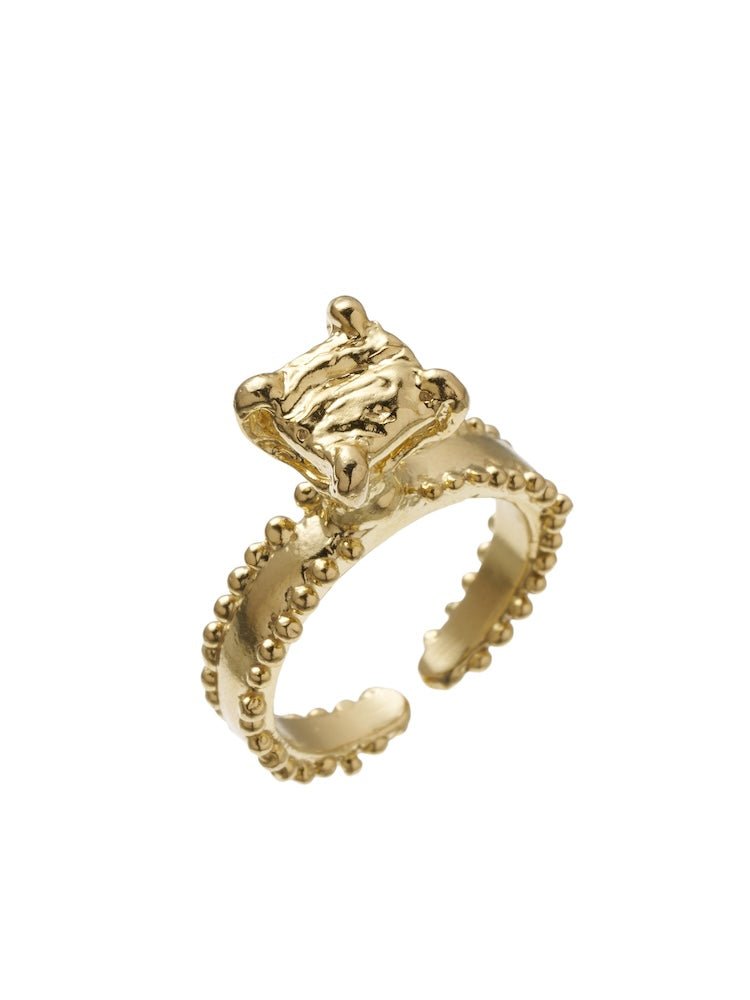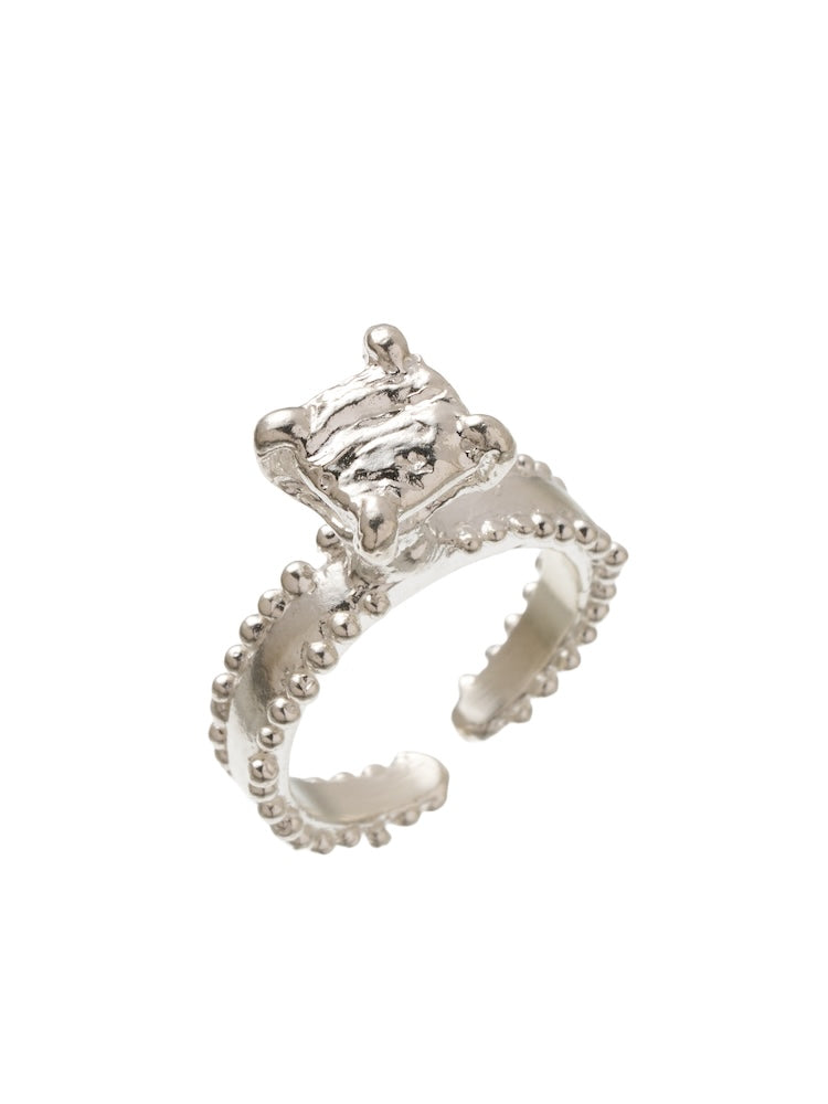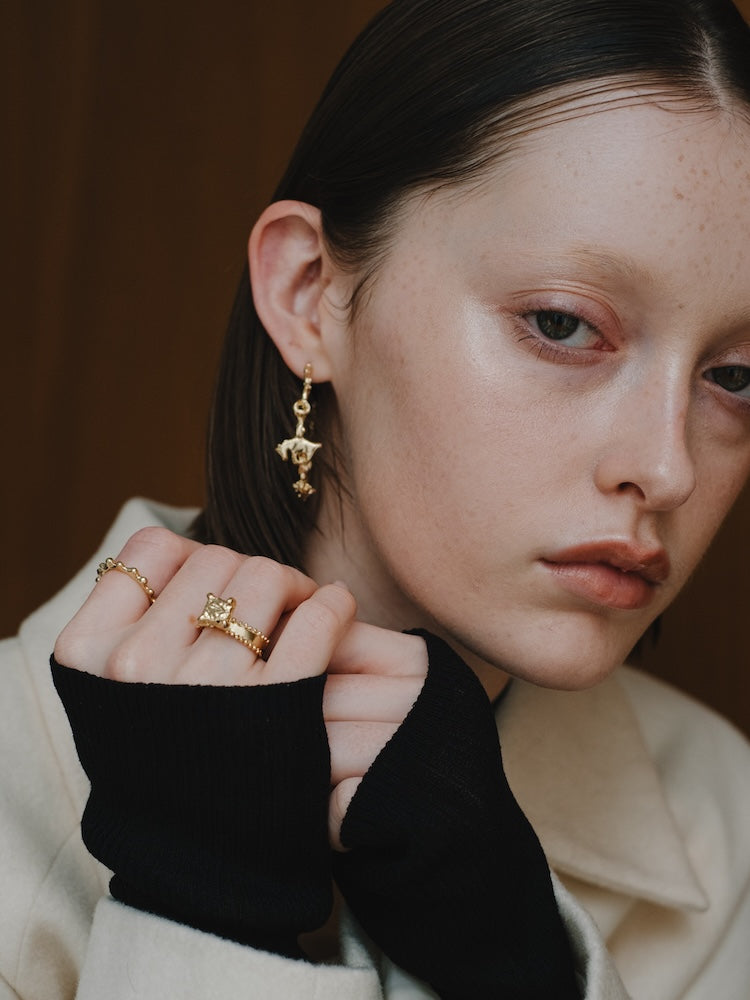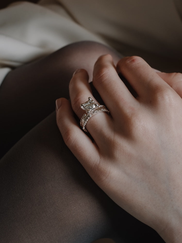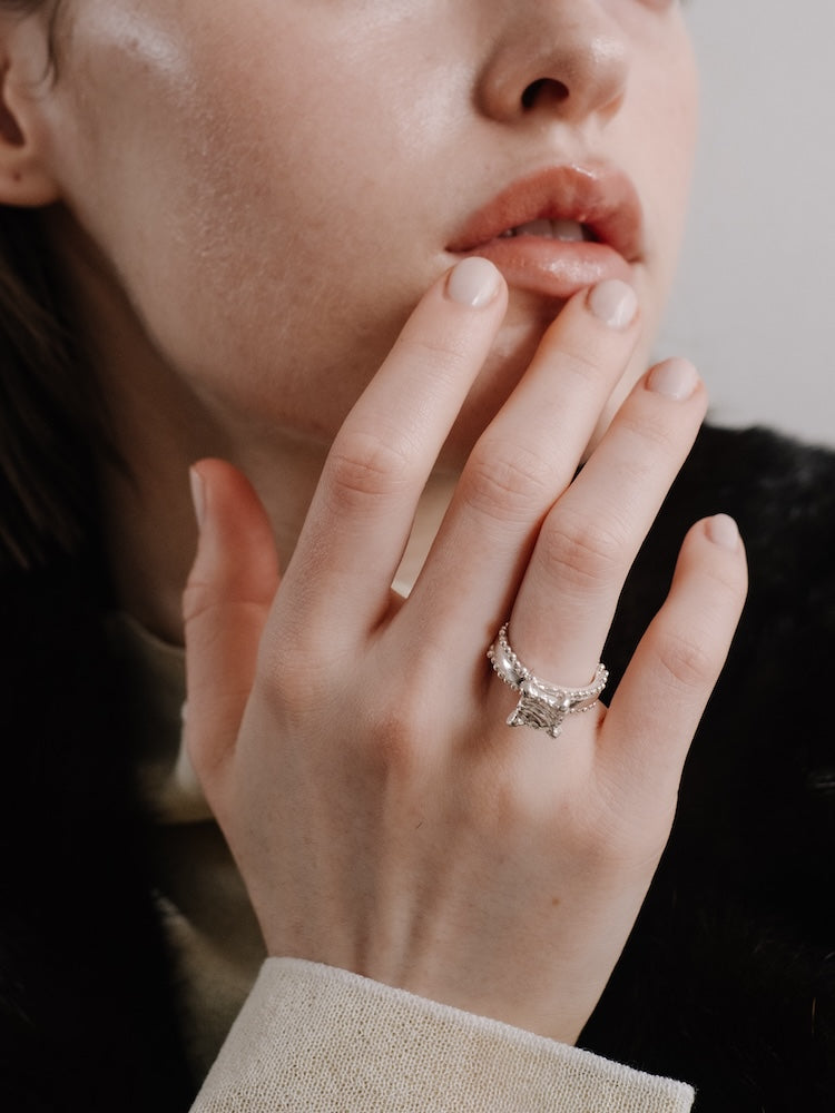 アンシエントなムードが漂うリング。アーム部分は細やかな粒を連ねたデザインで、古代装飾のような繊細な表情を持たせました。