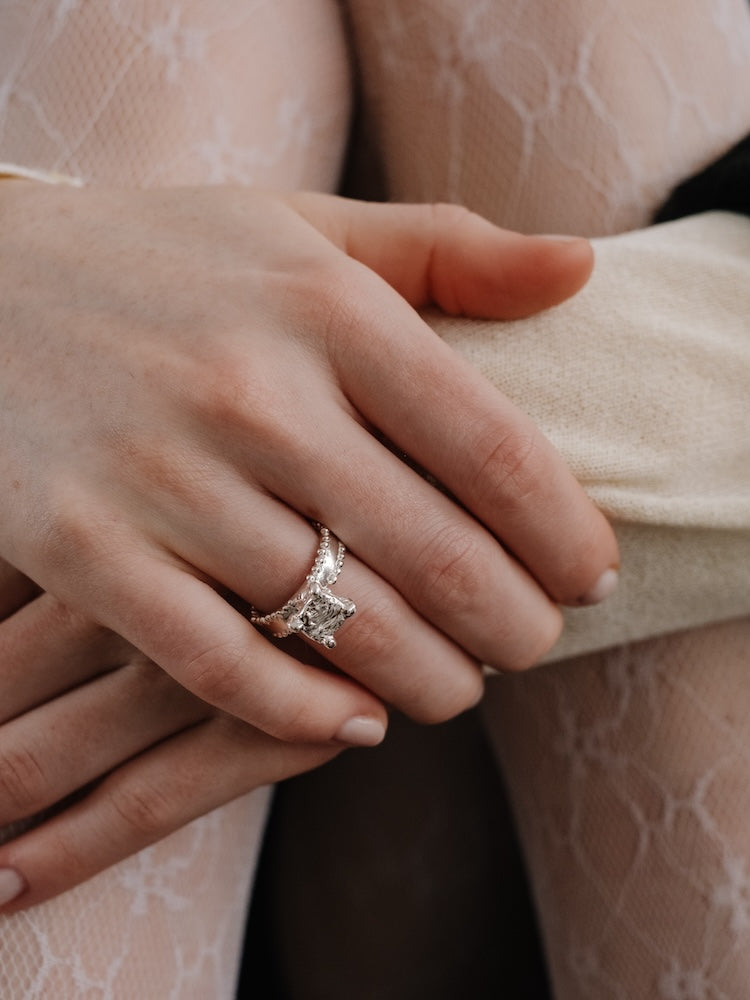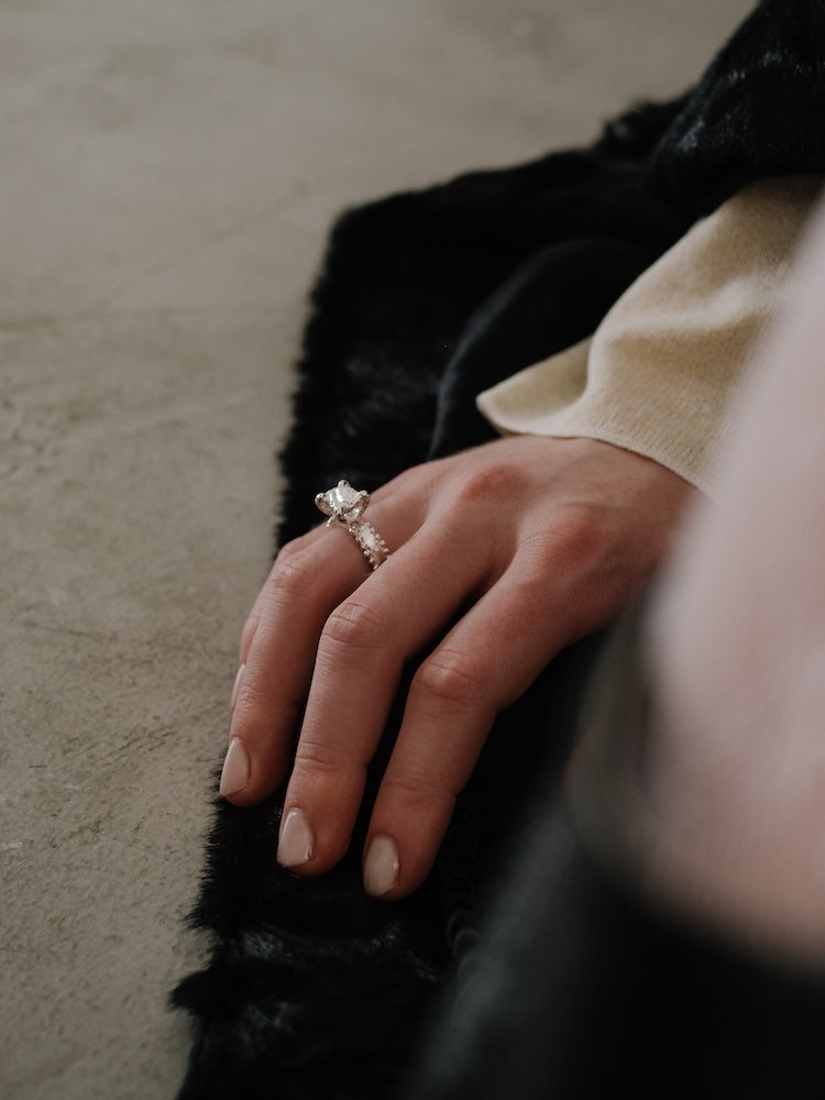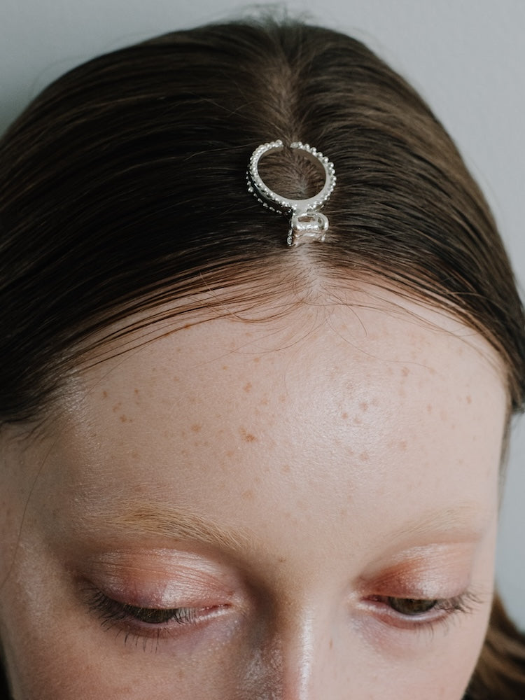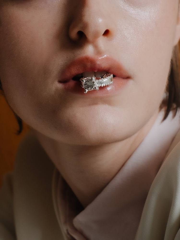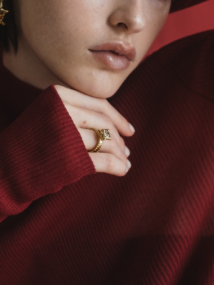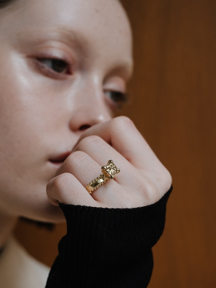 アンシエントなムードが漂うリング。アーム部分は細やかな粒を連ねたデザインで、古代装飾のような繊細な表情を持たせました。