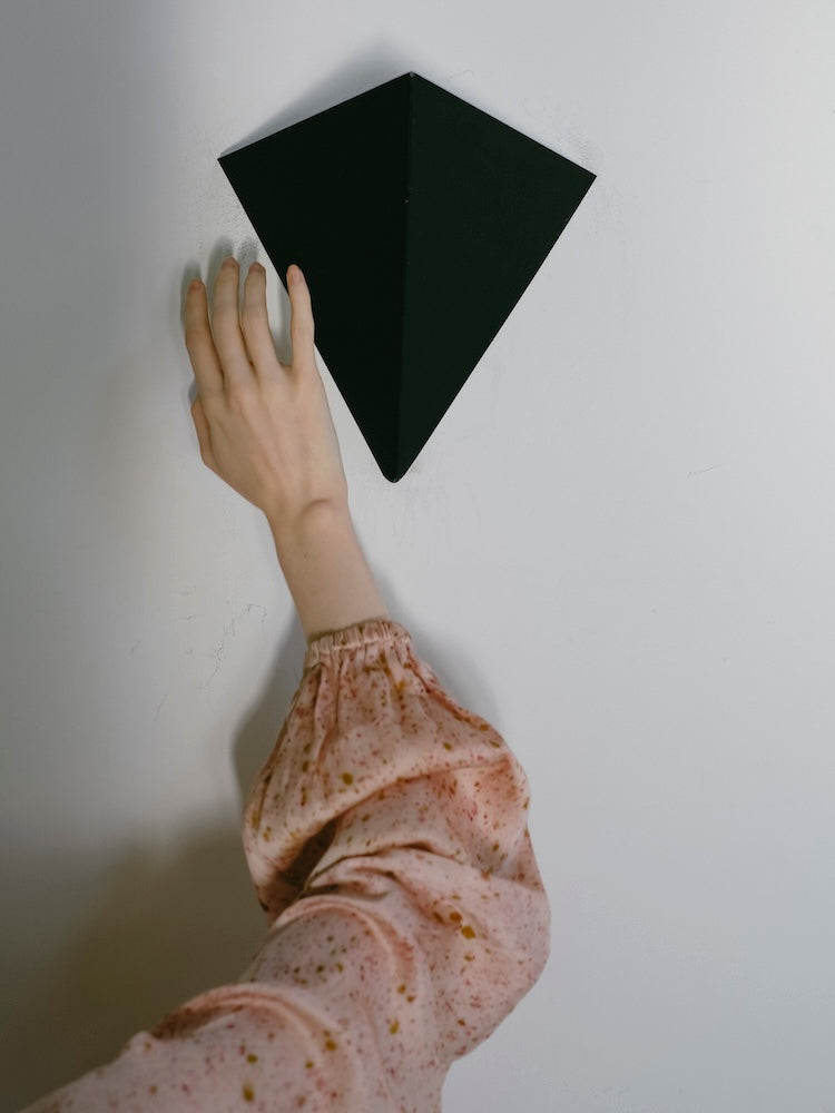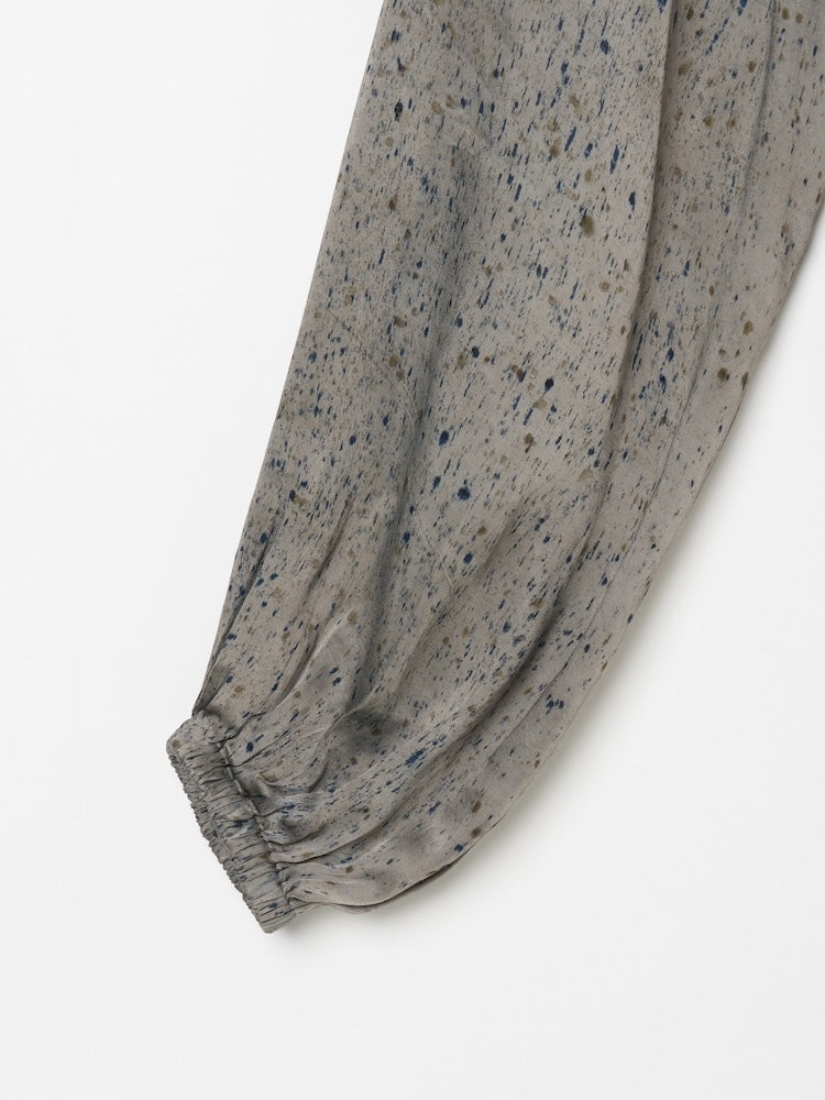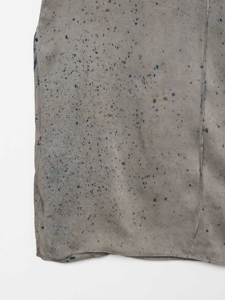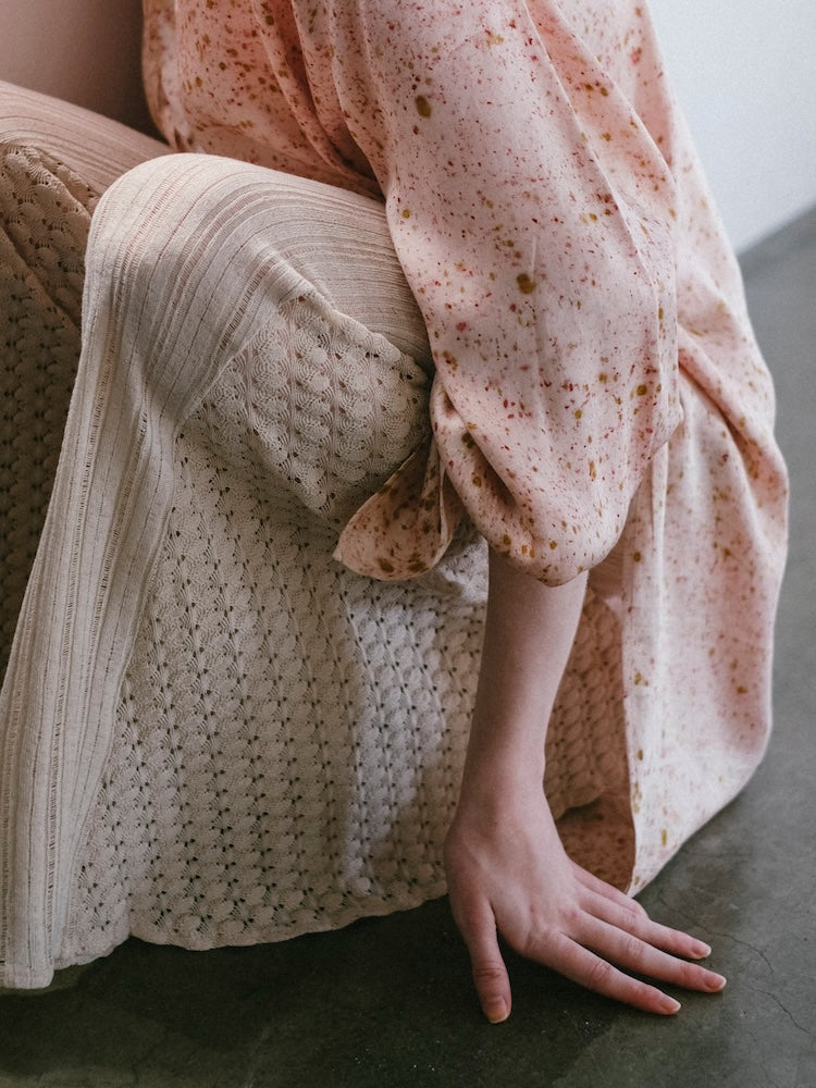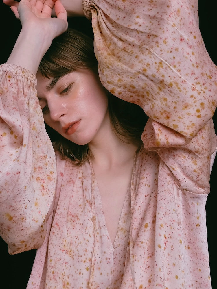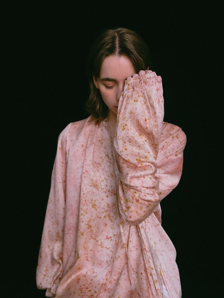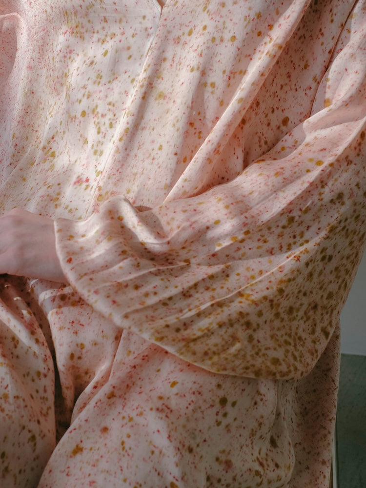 インドにて、滑らかな光沢をもつヴィーガンシルク生地の上に樹皮・果皮・根・発酵素材といった染料植物を不規則に配置。棒状に巻き付けて蒸し上げることで、植物がもつ色素や輪郭をそのまま布へと写しとる染色技法”バンドルダイ”。一点一点手作業で染色されたオリジナルテキスタイル。