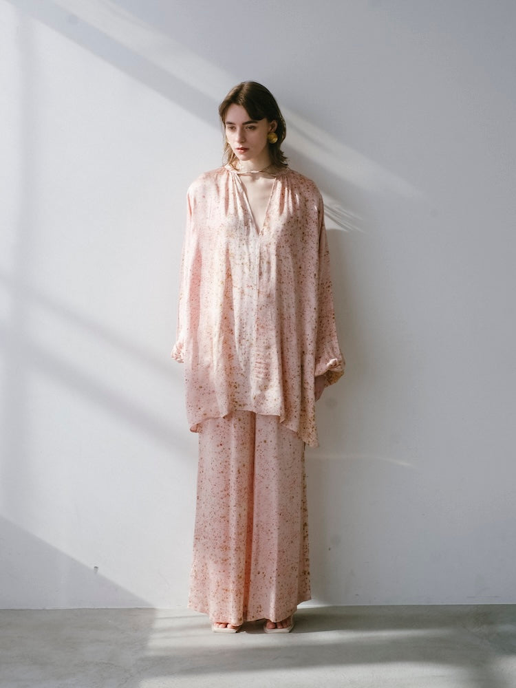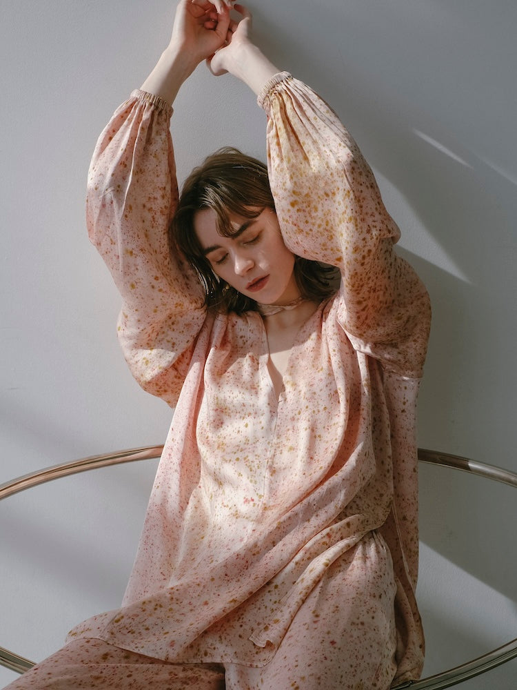 とろけるように柔らかく、しなやかに落ちるヴィーガンシルクが肌に触れた瞬間から上質さを感じさせるオーバートップス。