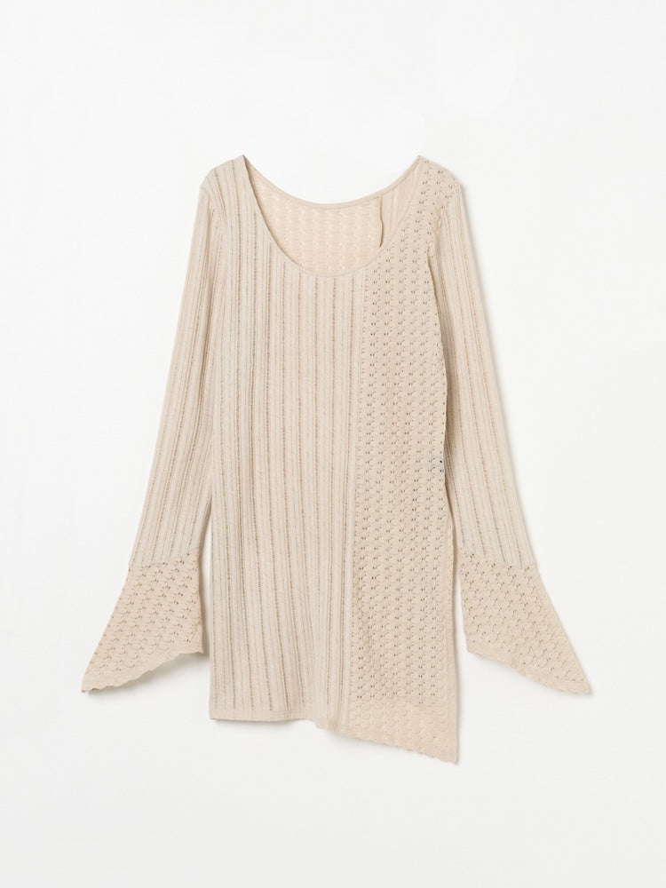 袖口はフレアを持たせ、深めのスリットを施すことで動きに合わせて軽やかな抜け感が生まれます。程よい素肌の見え方が着用時に自然な開放感を与えます。