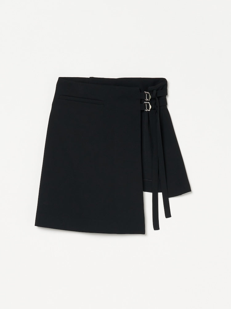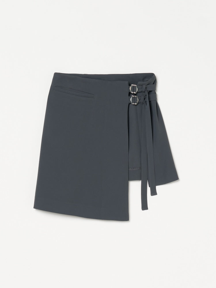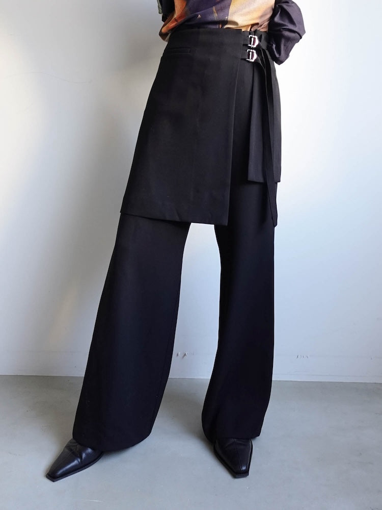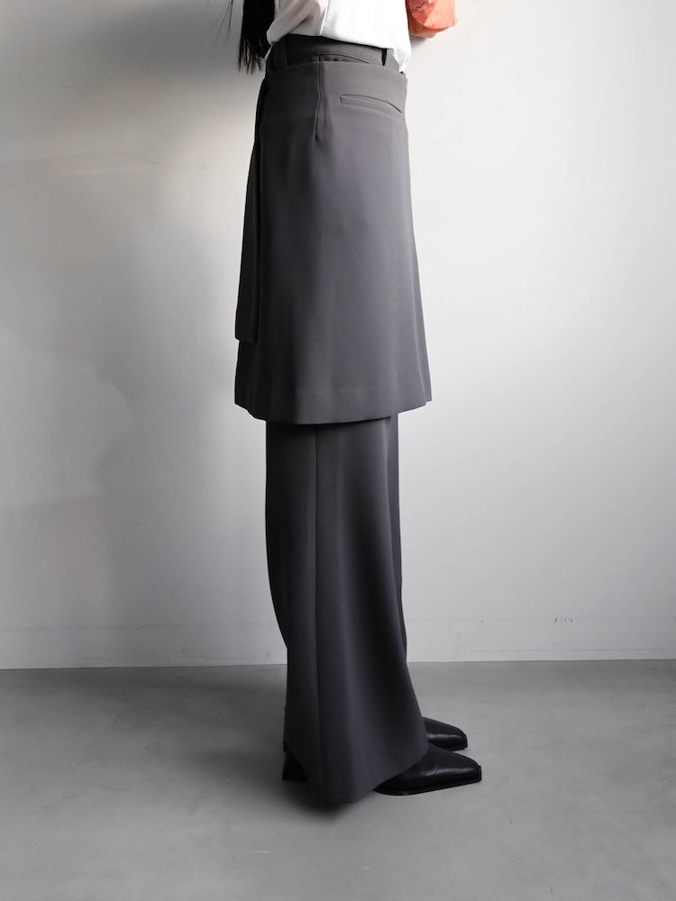 モードな存在感を放つアシンメトリーなデザインのエプロンをレイヤード。