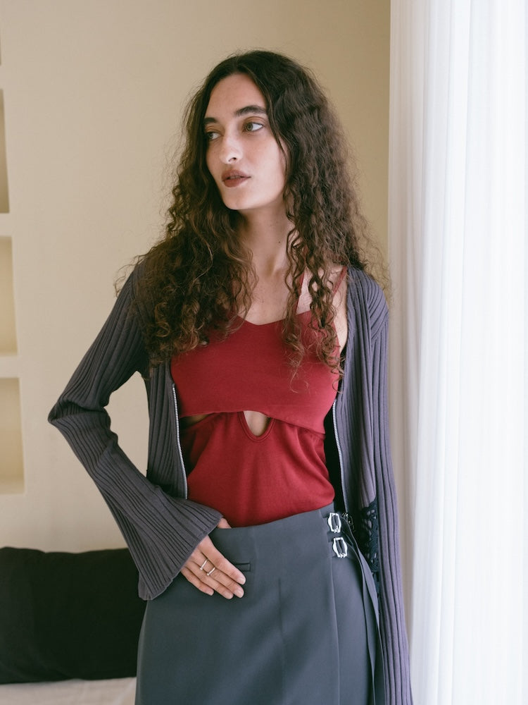 適度なハリと美しいドレープ性を兼ね備えたこの素材感が、カジュアルに転びがちなレイヤードを、女性らしさのある装いへと昇華させます。