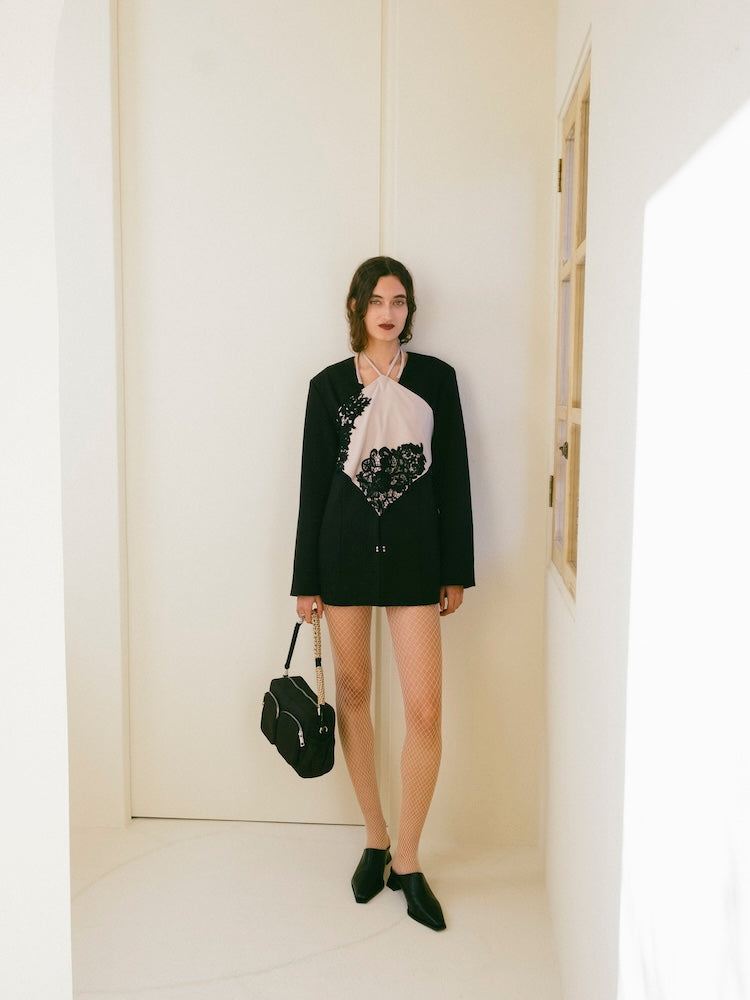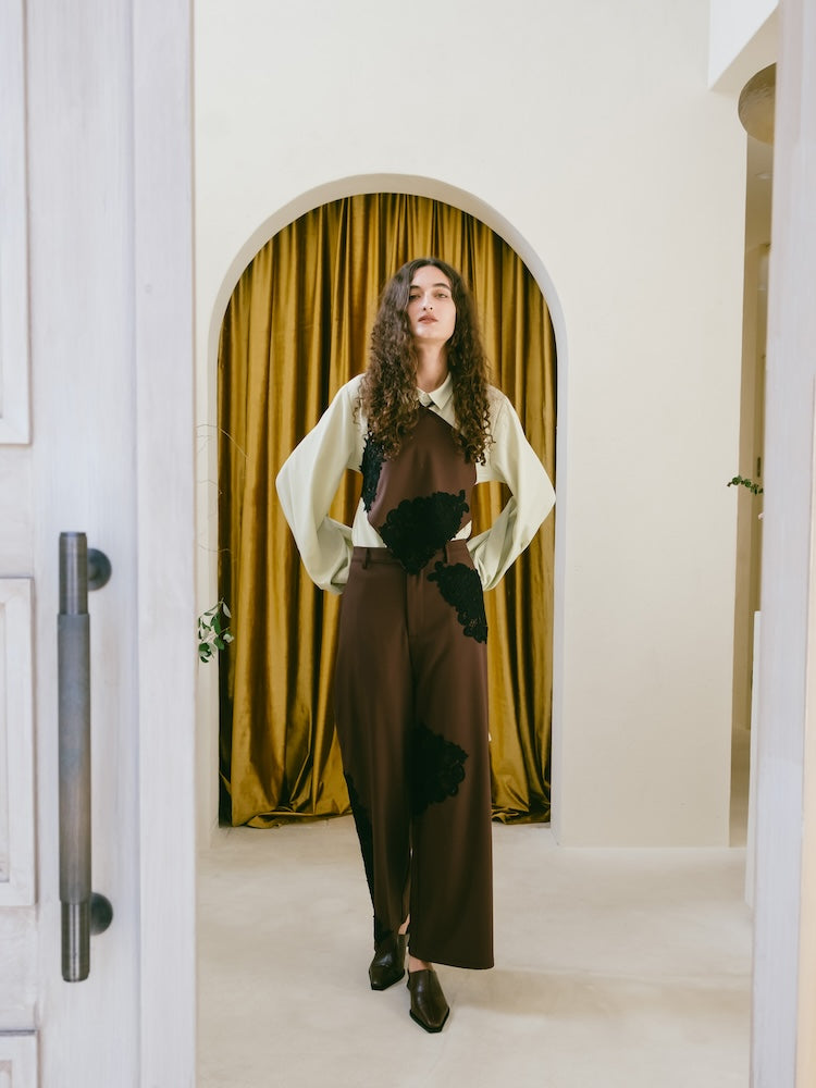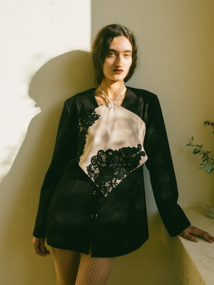 ツイル素材に繊細なレースを貼り合わせた、コントラストが美しいビスチェ。