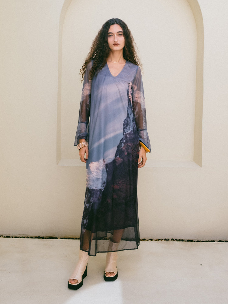 大自然の情景やアートをシアー素材と裏地の両面に転写プリント。透明感のある模様ながらも動くたびに奥行きのある立体感が生まれるロングドレス。
