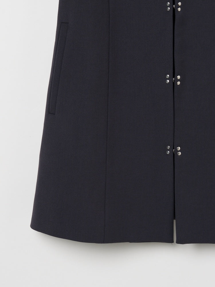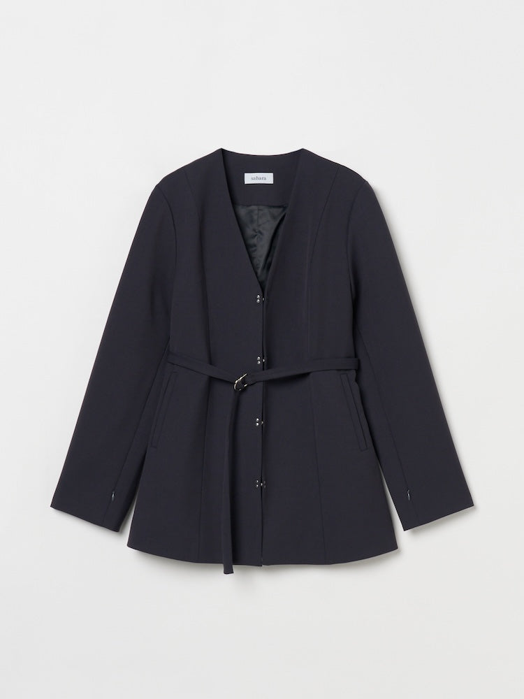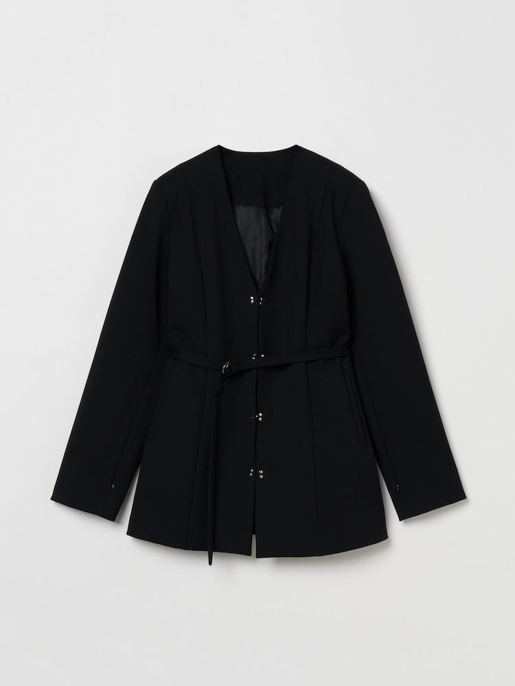 デコルテを美しく引き立てるノーカラーに、ミニマルなシルバーパーツが映える一着。