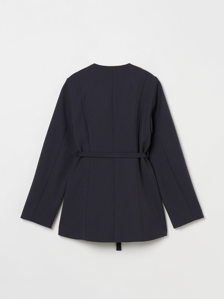 軽く滑らかな肌触りで着心地の良いジャケットです。前のタックが身体のラインを綺麗に見せてくれます。丈感はお尻がすっぽり隠れる丈感です。ウエストマークできるリボンもついているので、スタイルアップできそうです。