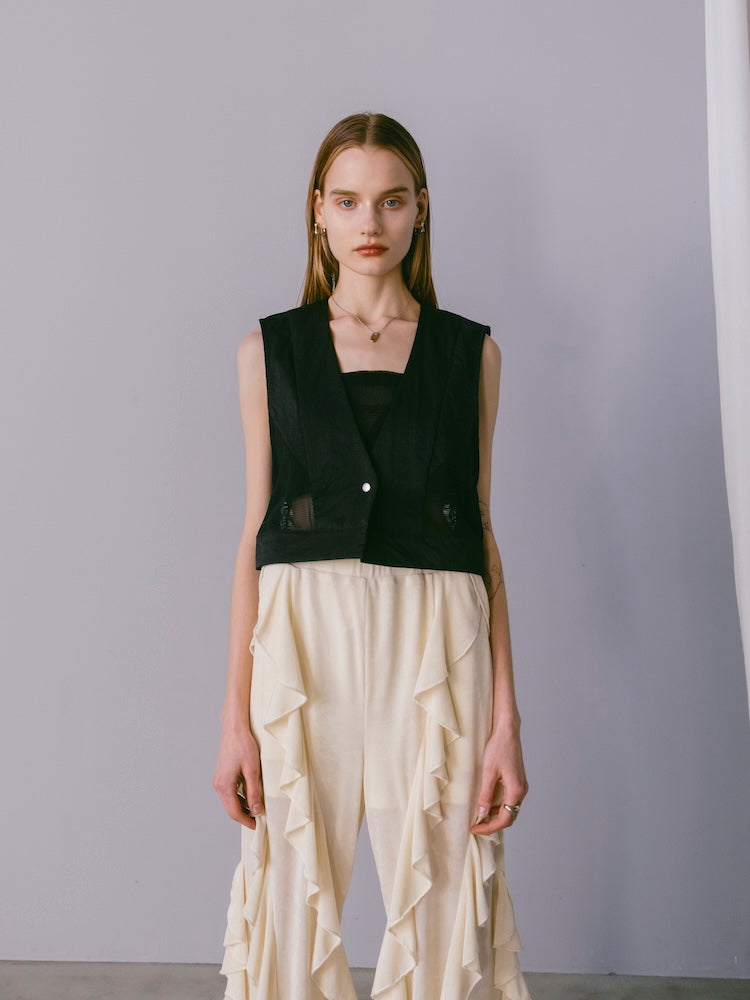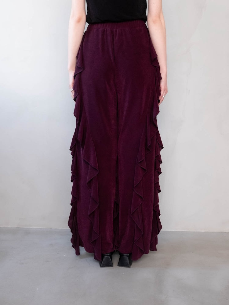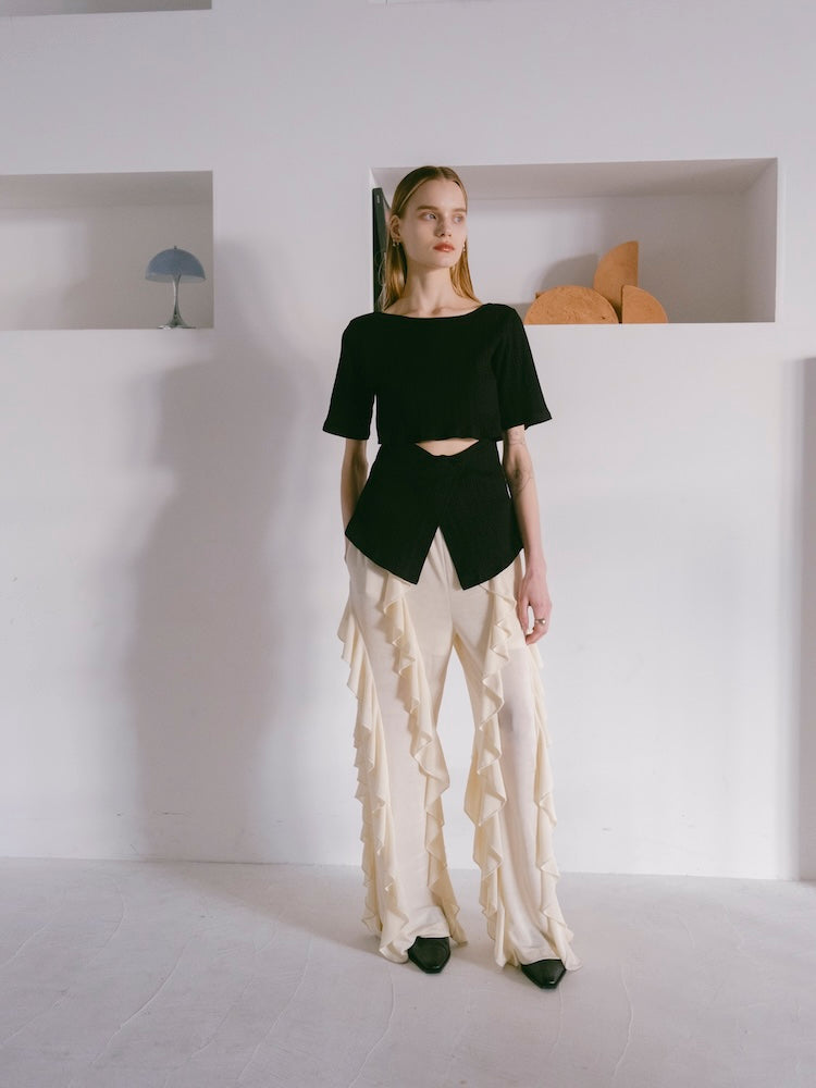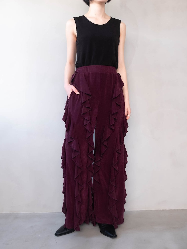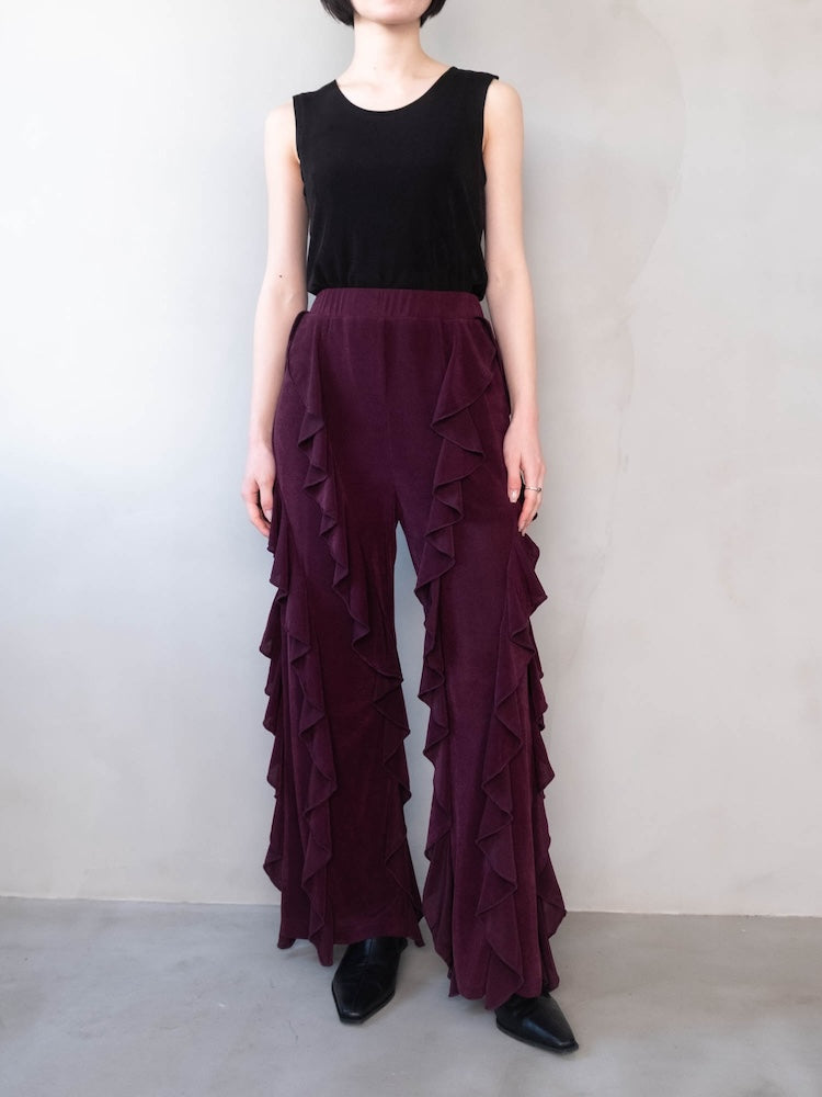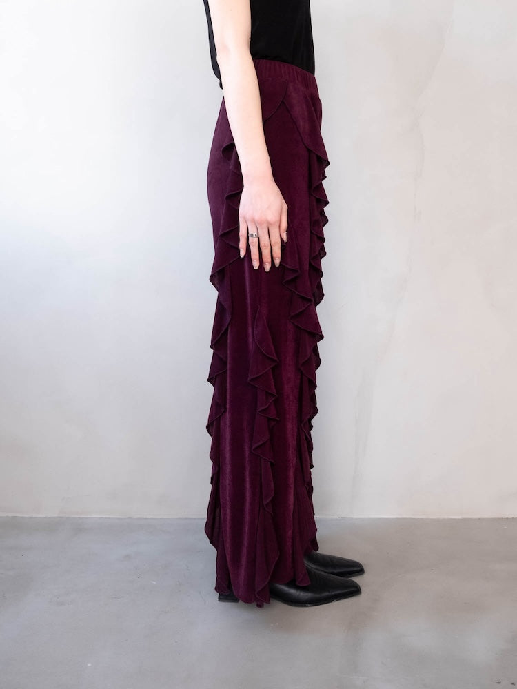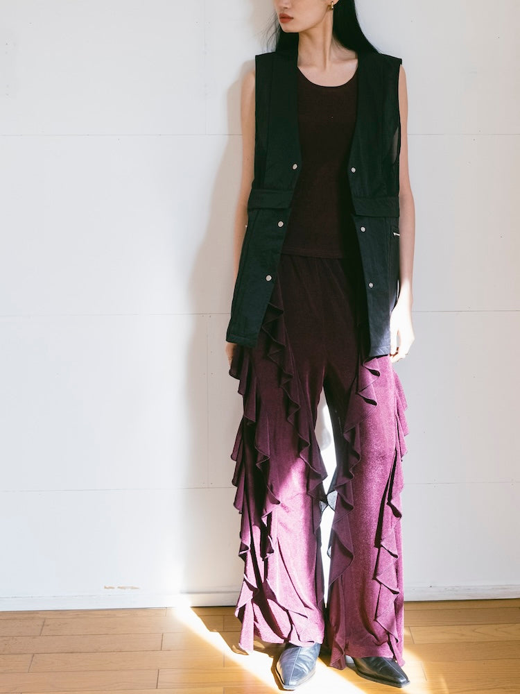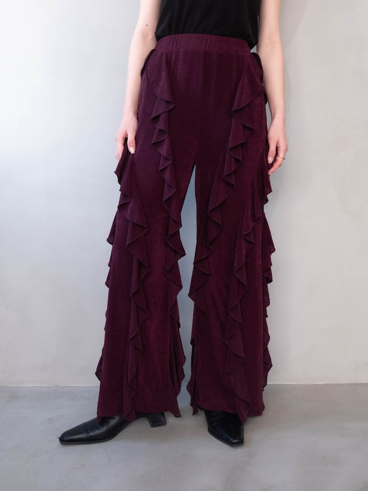 縦のラインに重なるフリルディテールが印象的なデザインパンツ。