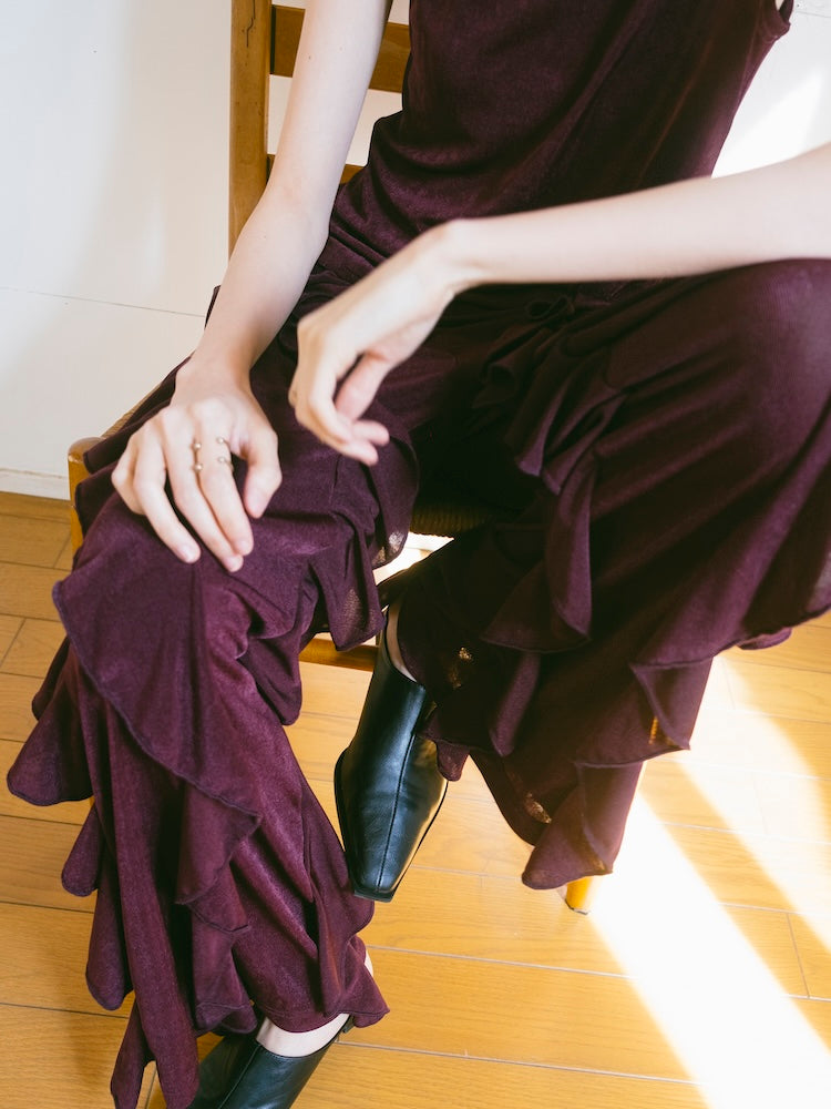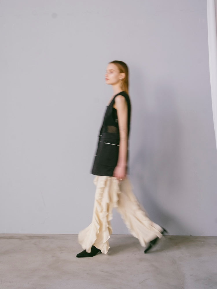 流れるように配されたフリルが動きに合わせて揺れ、装いに奥行きを与えます。