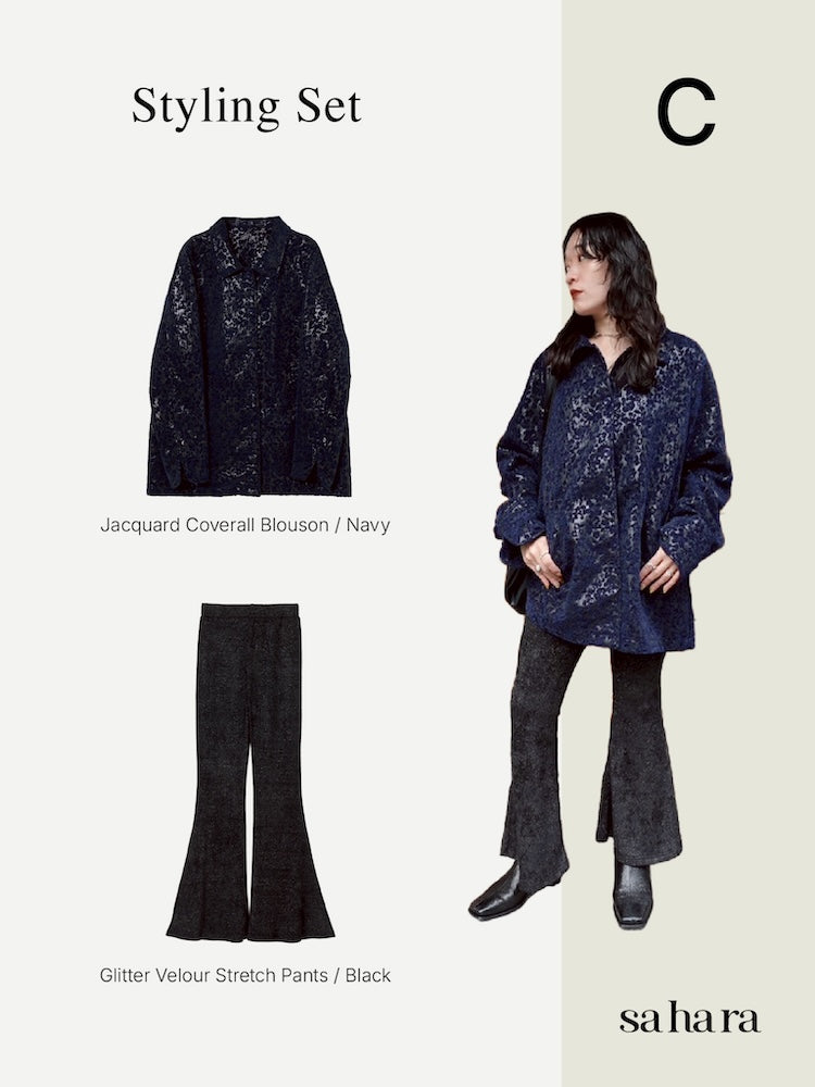Jacquard Coverall Blouson あり / Glitter Velour Stretch Pants あり