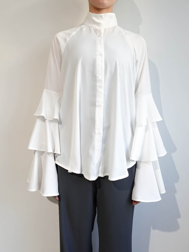 腕のフリルが目を引くブラウス。コーディネートにも取り入れやすいカラーリングで、このシャツを合わせるだけで女性らしい雰囲気を楽しめます。丈はお尻が隠れるくらいの長さでした。