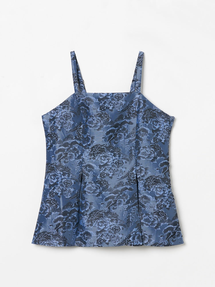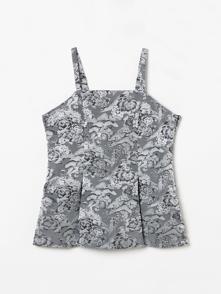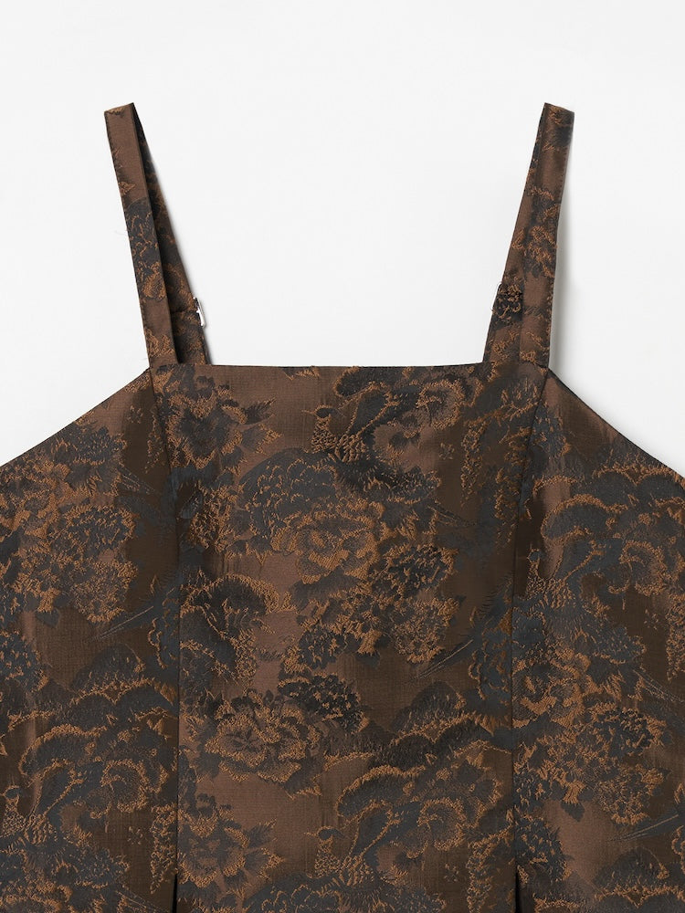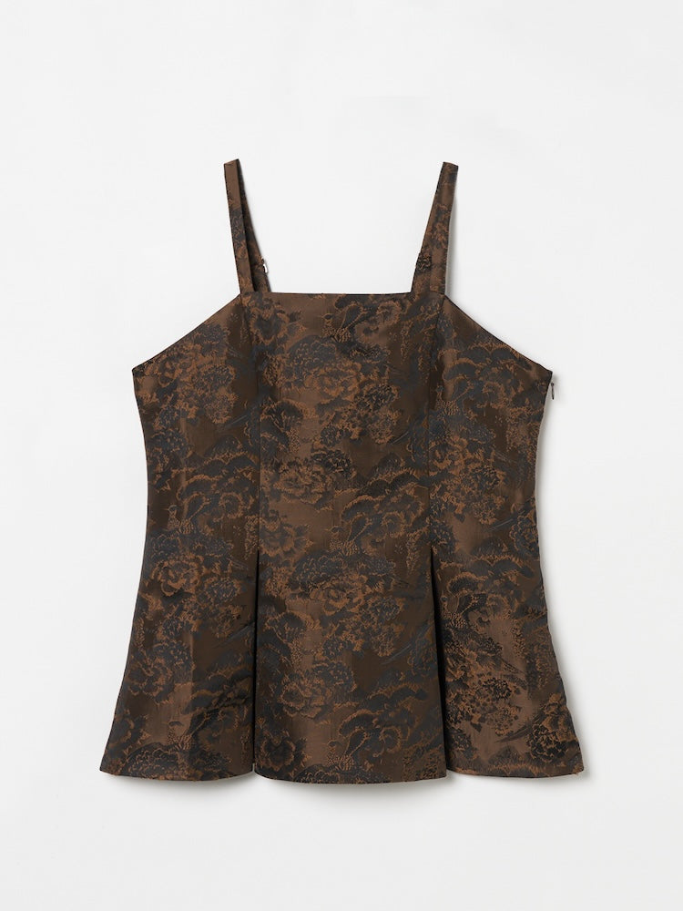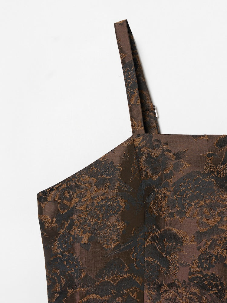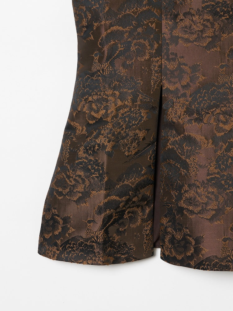 立体感のあるジャガード素材が印象的なビスチェ。落ち着いたトーンの柄で取り入れやすく、シンプルなインナーに重ねるだけでスタイリングが完成します。裾に向かってやや広がるシルエットで、気になる腰まわりを自然にカバーしてくれるのも嬉しいポイント。