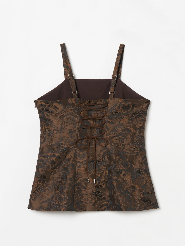 背中がレースアップなのでサイズの微調整が可能。胸がある方/ない方どちらも楽しめるようなデザインです。ジャガード織のため比較的肉厚な生地なので下着やインナーのアタリも気にせずご着用できます!