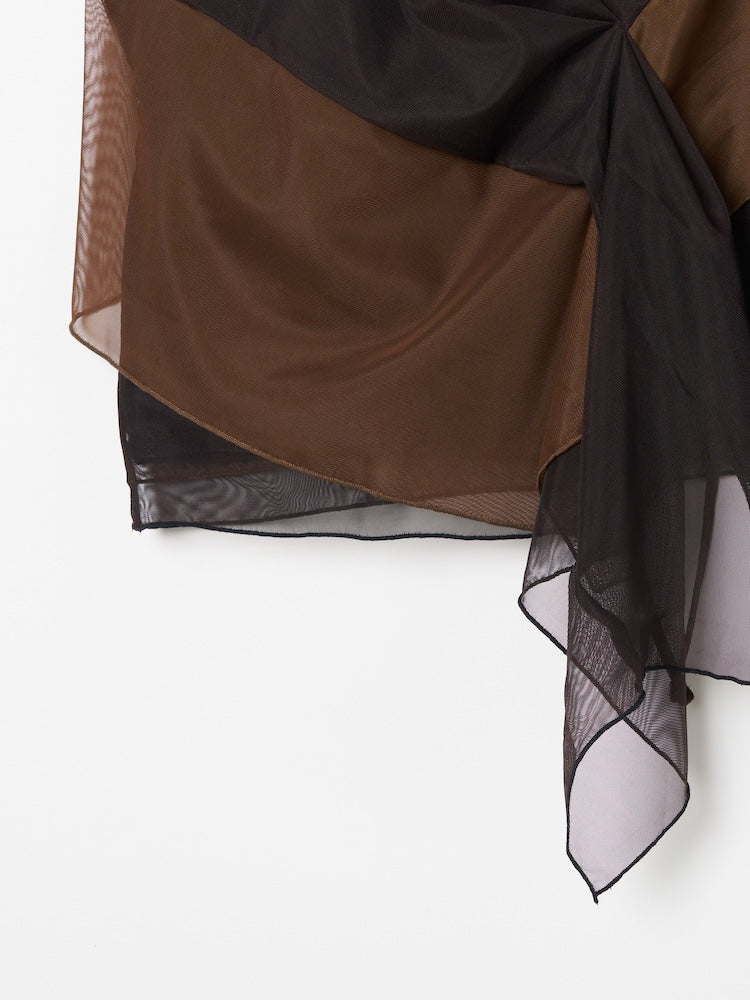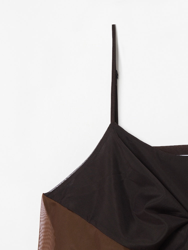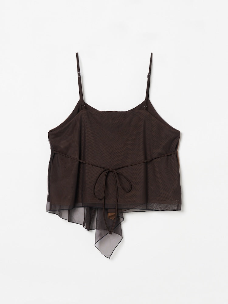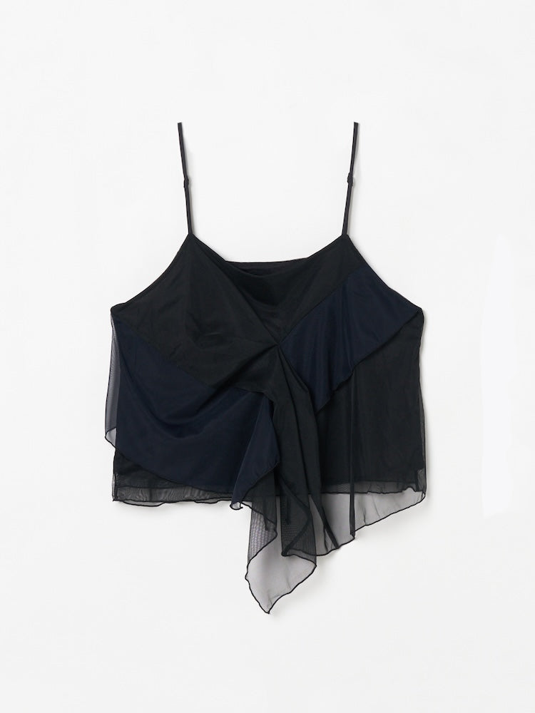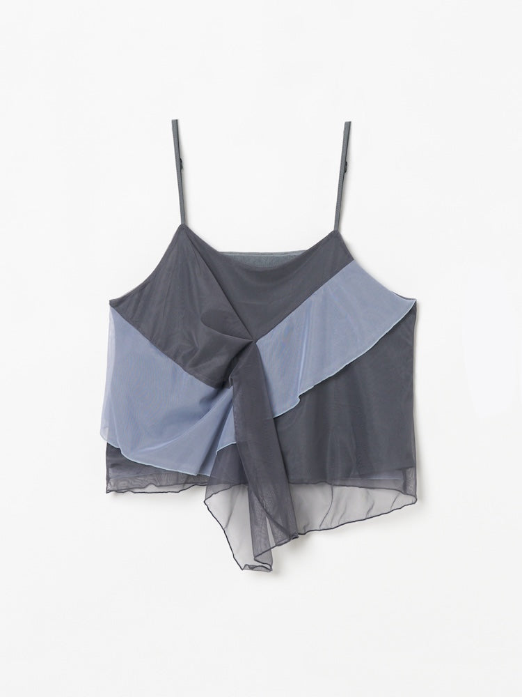 チュール素材のアシンメトリーなシルエットと、バイカラーデザインが印象的なキャミソールトップス。