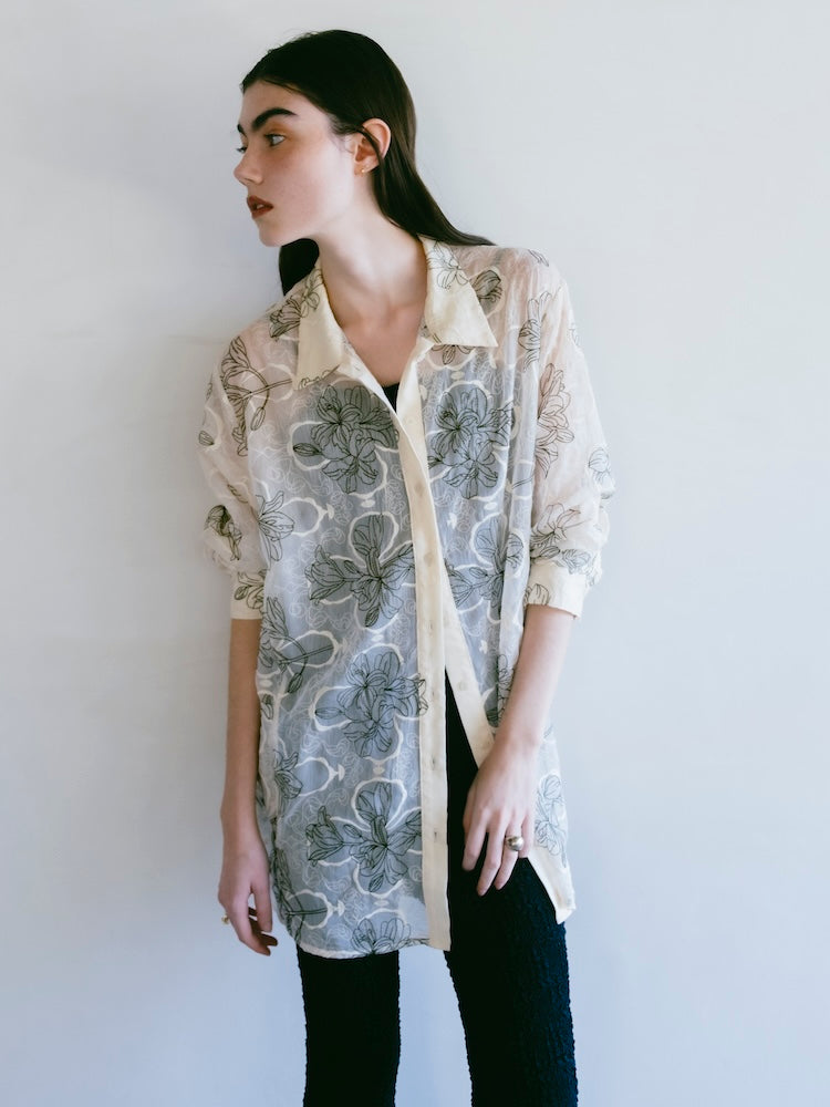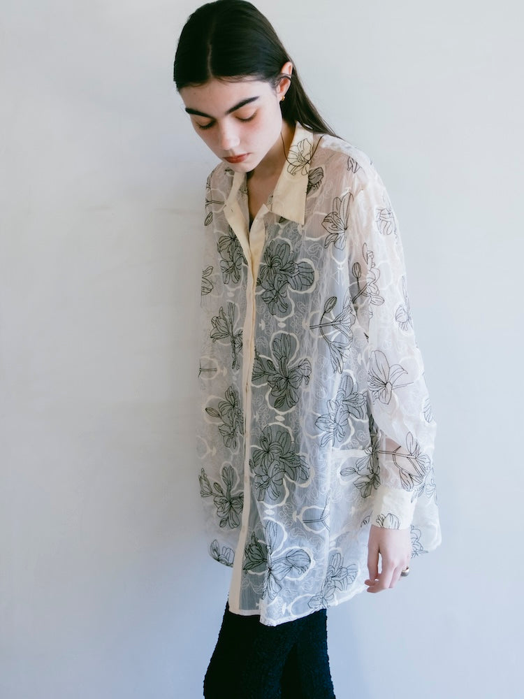 繊細なフラワーモチーフの刺繍が印象的。オーバーサイズのシアーシャツ。