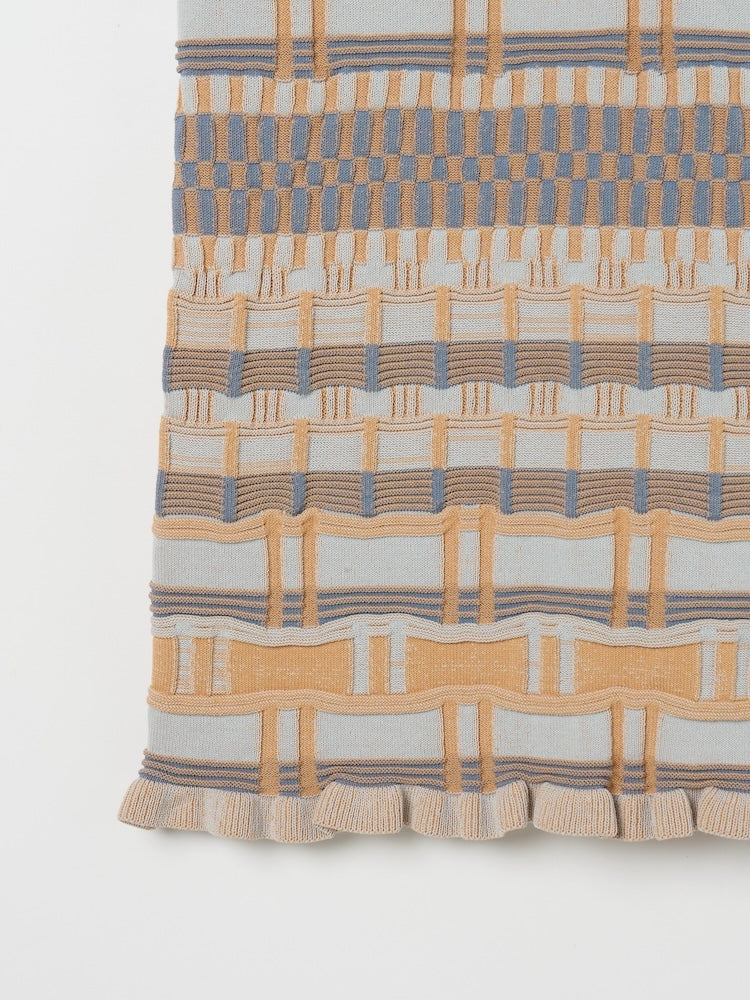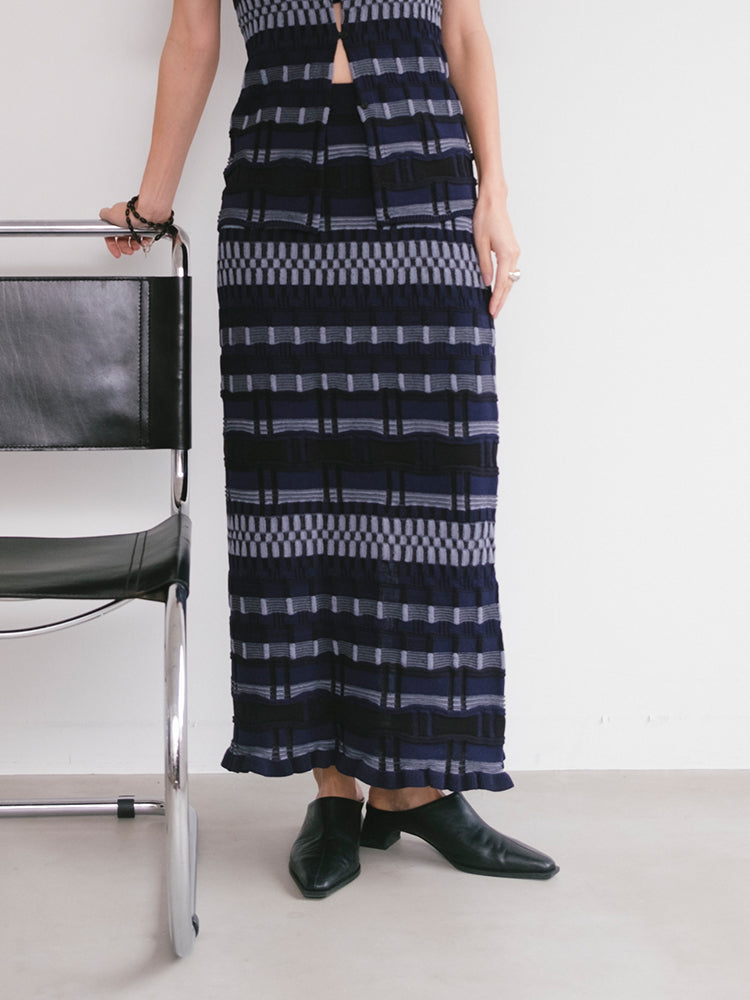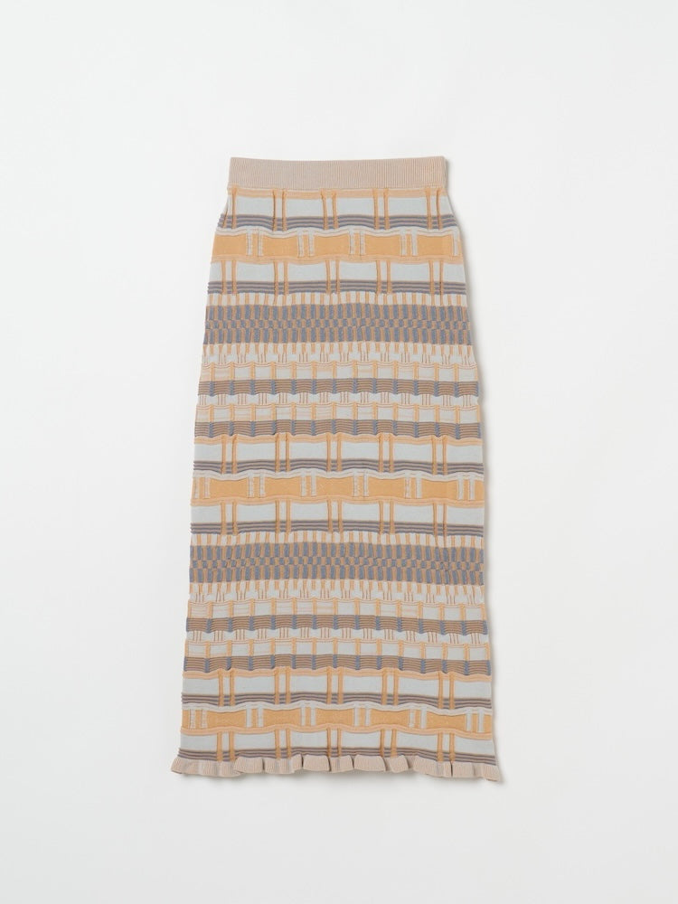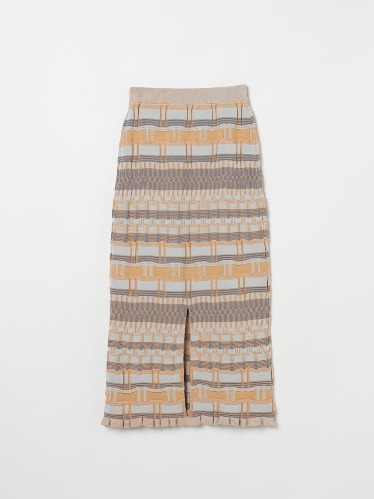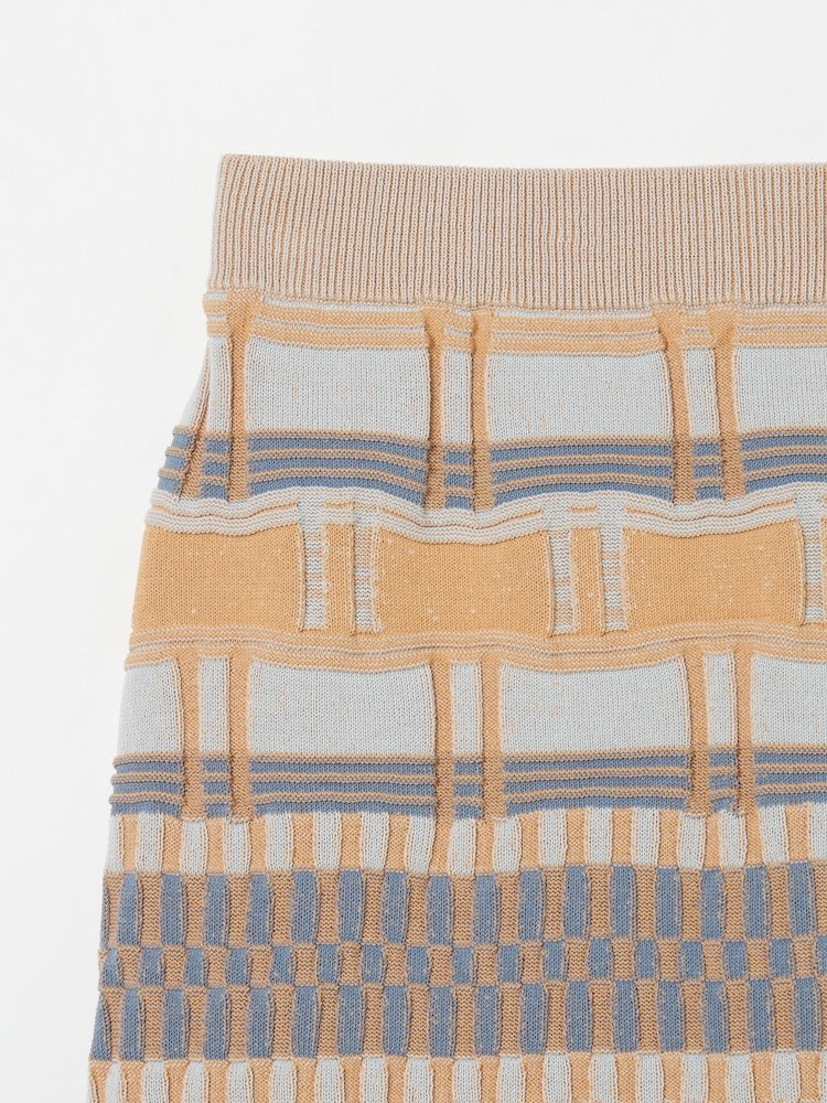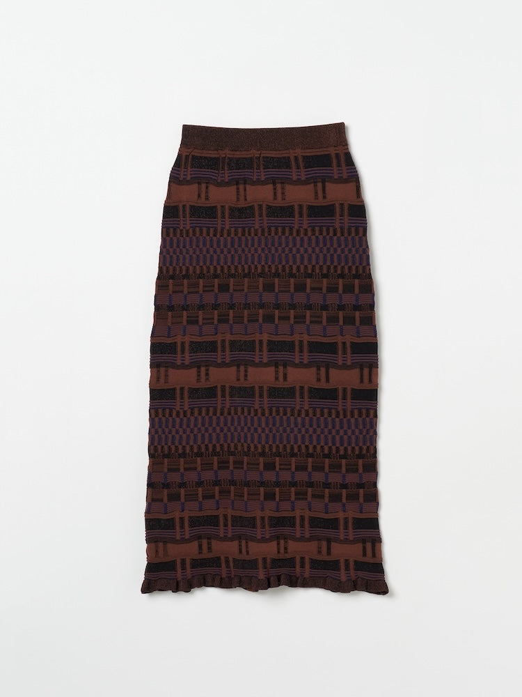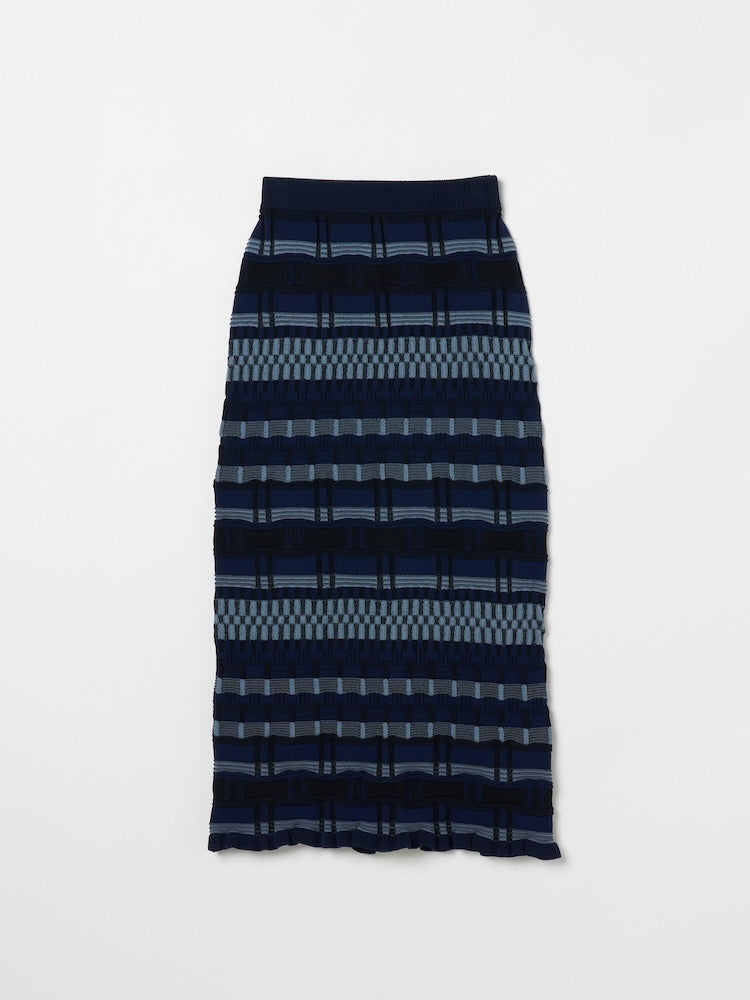 自然界に見られる層や断面の構造美、生成のリズムから着想を得て、立体的な編み組織へと落とし込んだスカート。