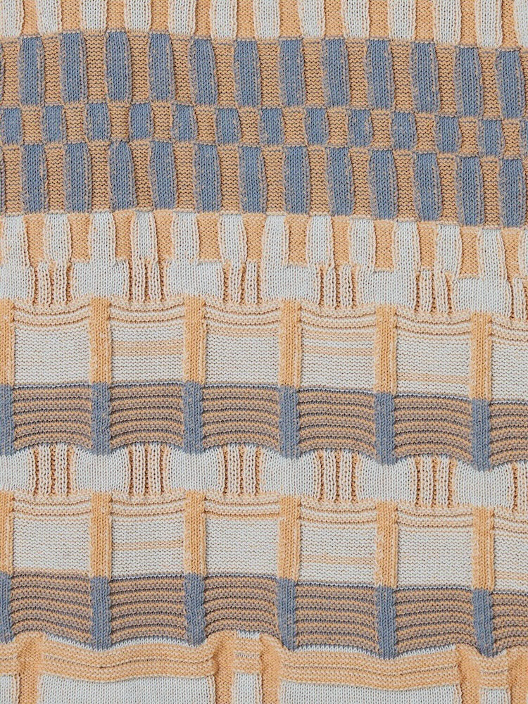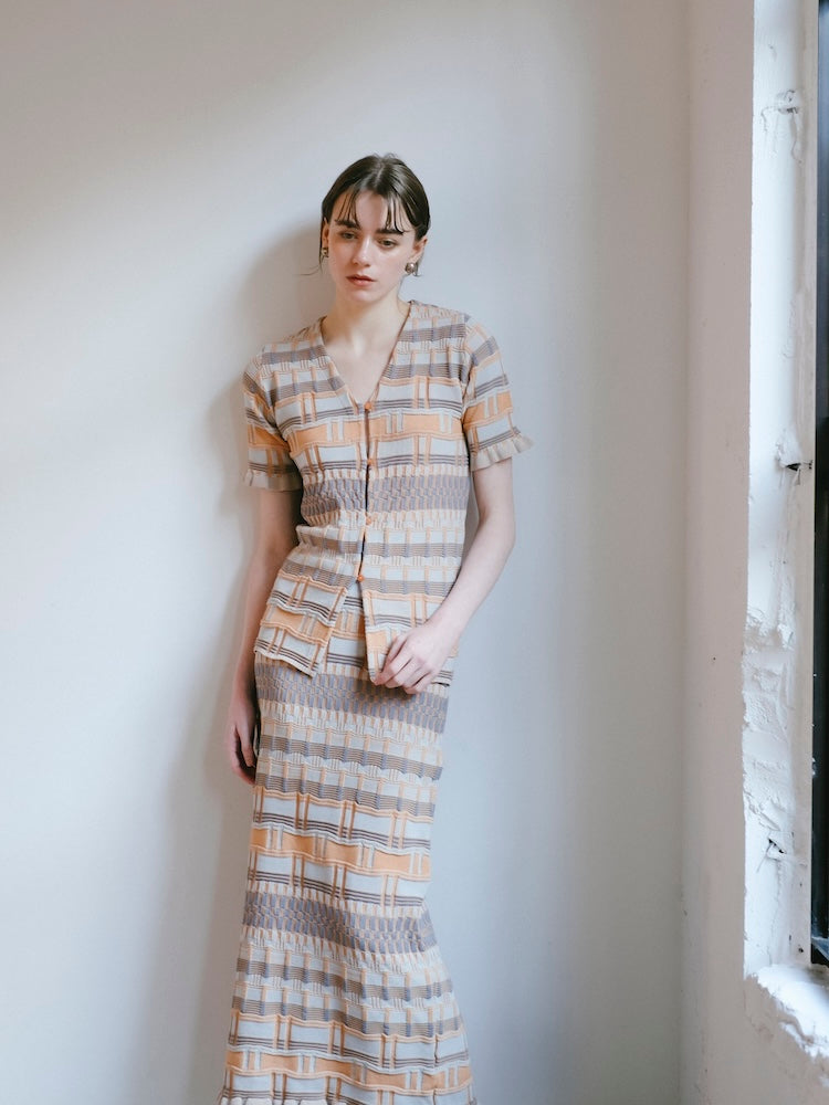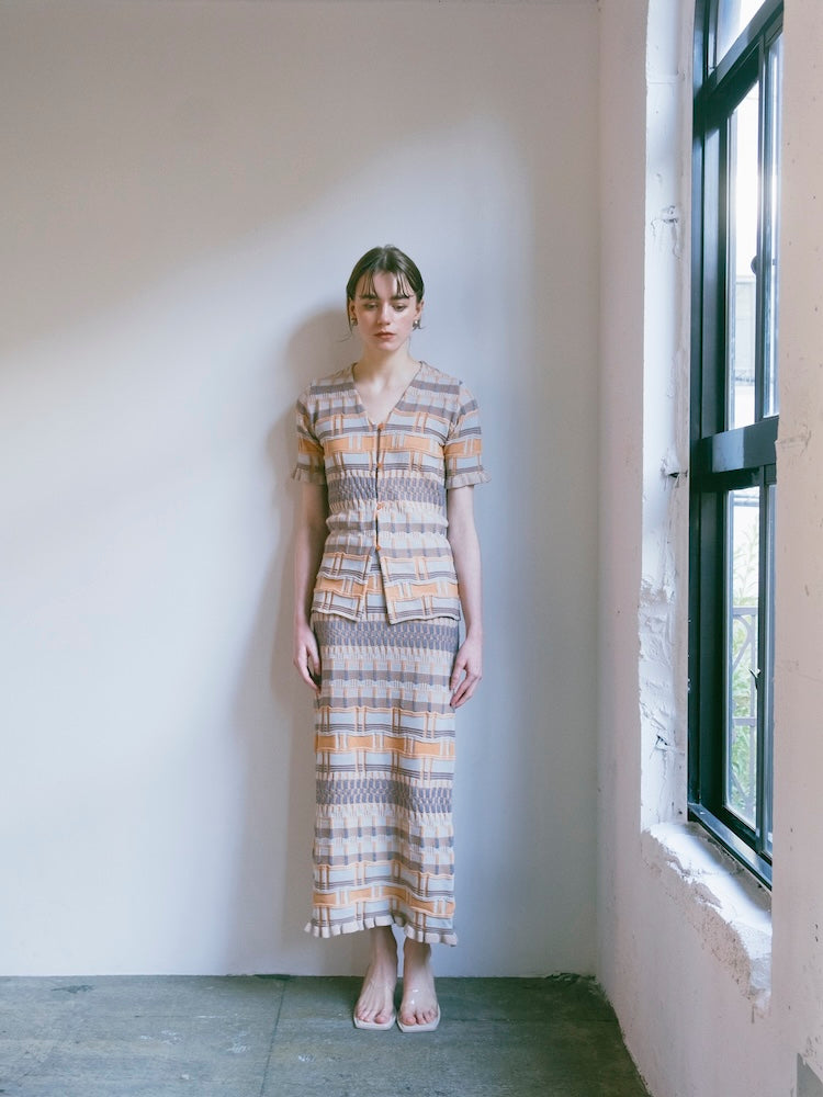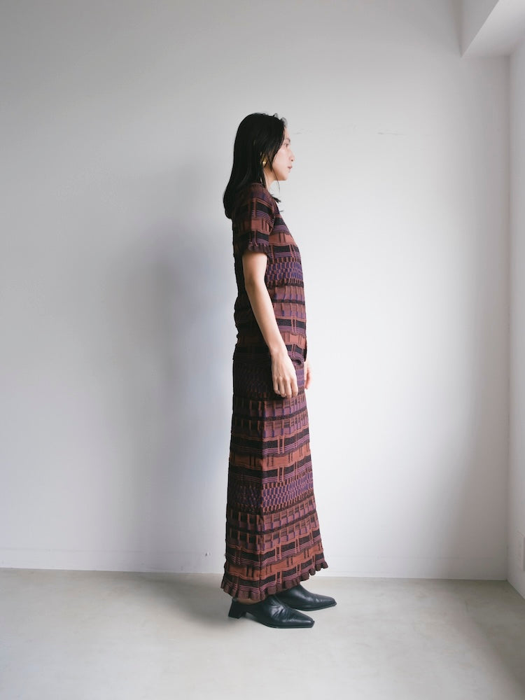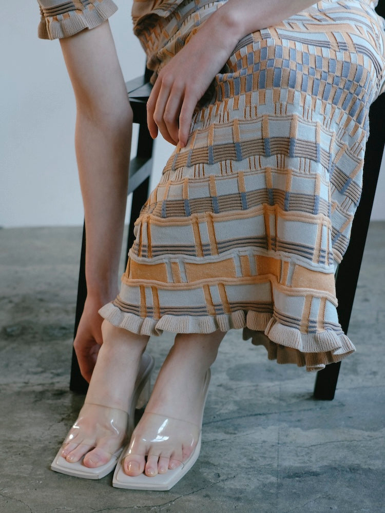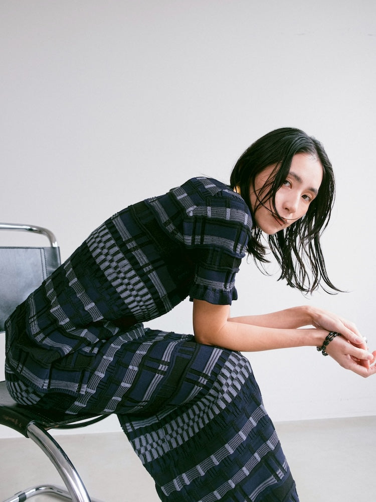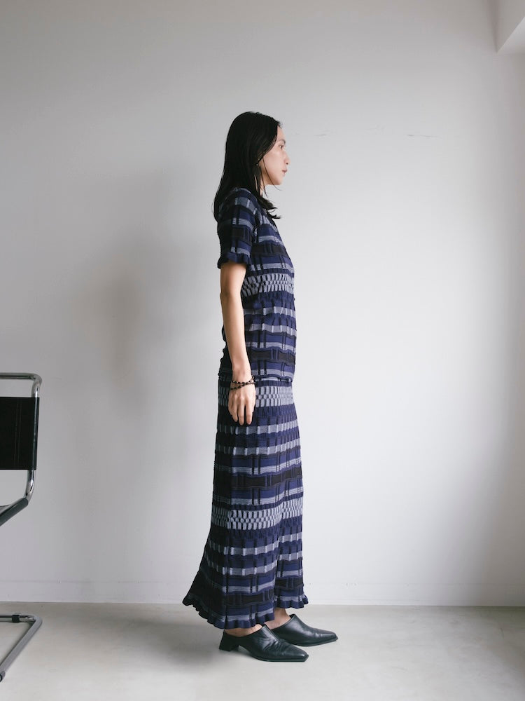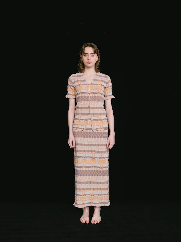 自然界に見られる層や断面の構造美、生成のリズムから着想を得て、立体的な編み組織へと落とし込んだスカート。