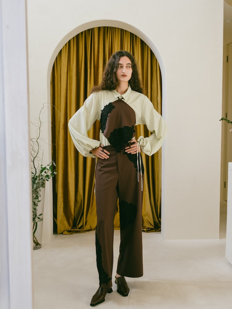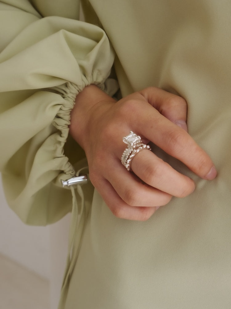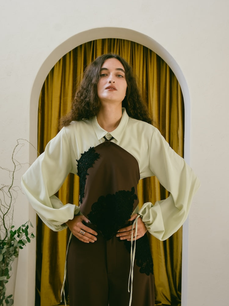 袖口の紐を絞ることでシルエットの変化を楽しめ、スタイリングに合わせたアレンジが可能です。一枚でさらっと着るのはもちろん、ベストやビスチェを重ねたスタイリングもおすすめ。