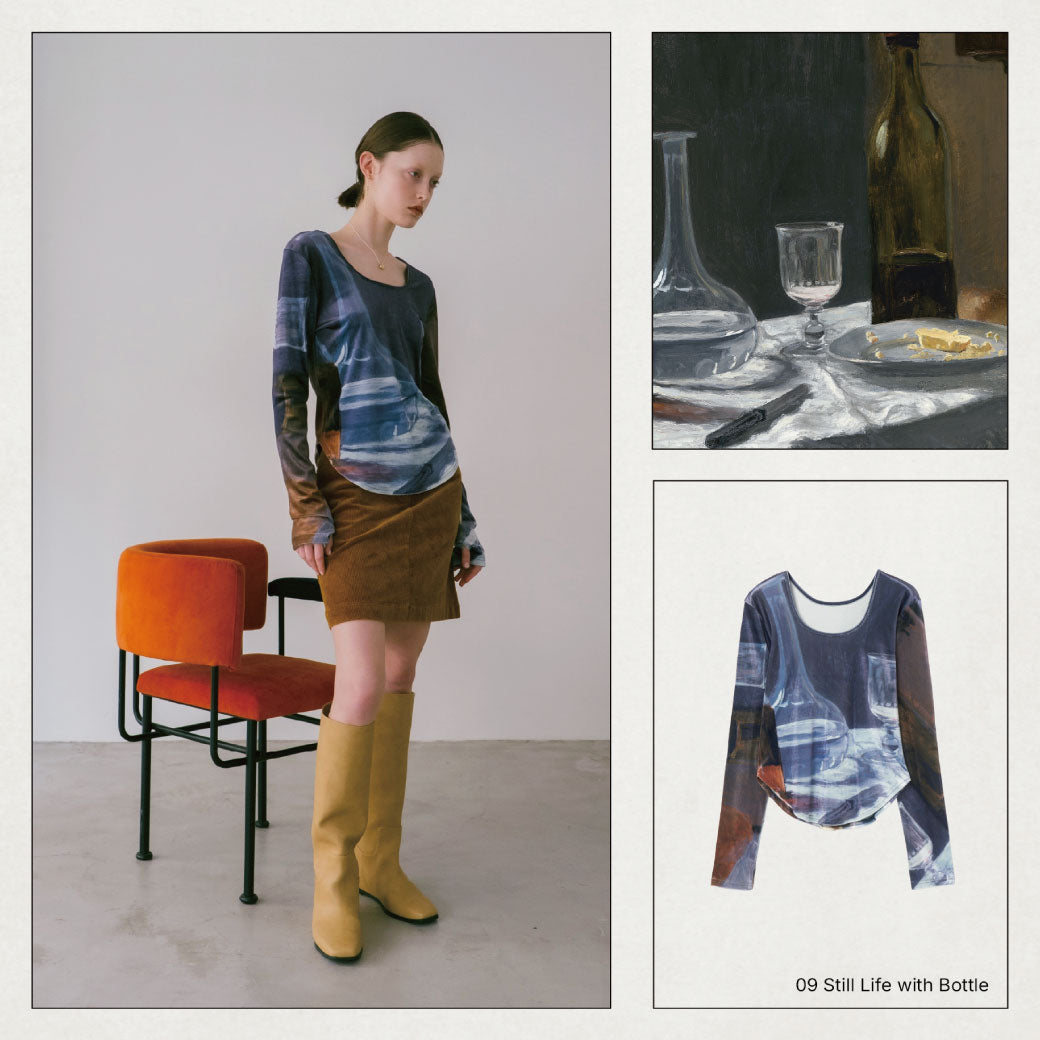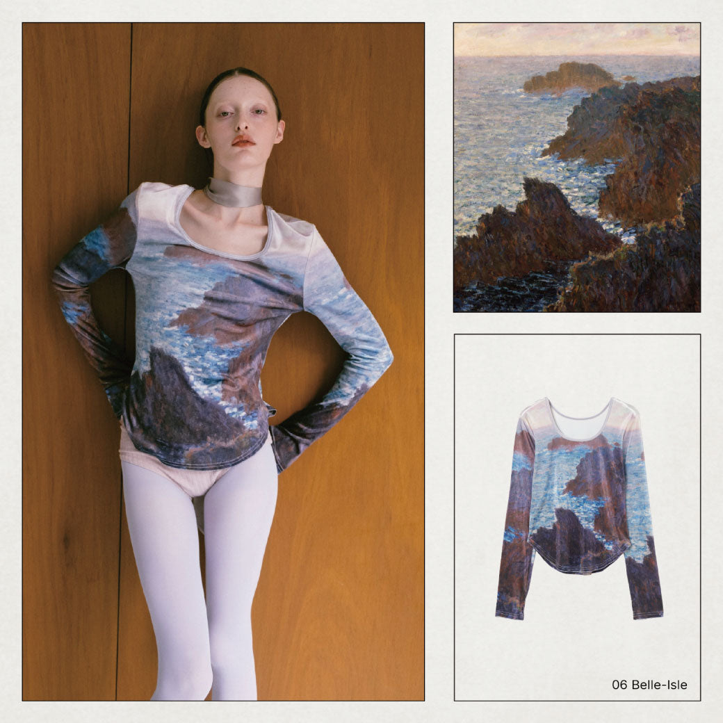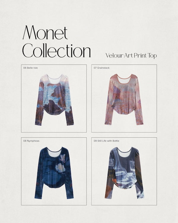 今回展開するVelour Art Print Topは、数あるモネの作品から「睡蓮」だけではなく、「ベル・イルの岩」「積みわら」「瓶のある静物画」の作品にフォーカスしています。