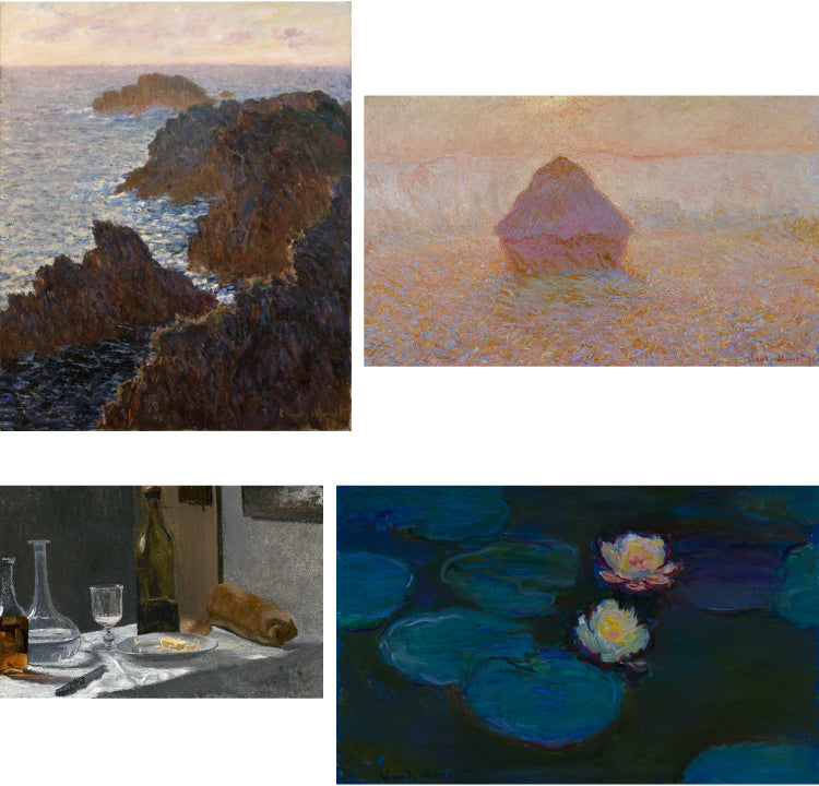 参考:画像左上から時計回りに、「ベル・イルの岩」「積みわら」「睡蓮」「瓶のある静物画」クロード・モネは19世紀後半に活躍したフランスの画家。