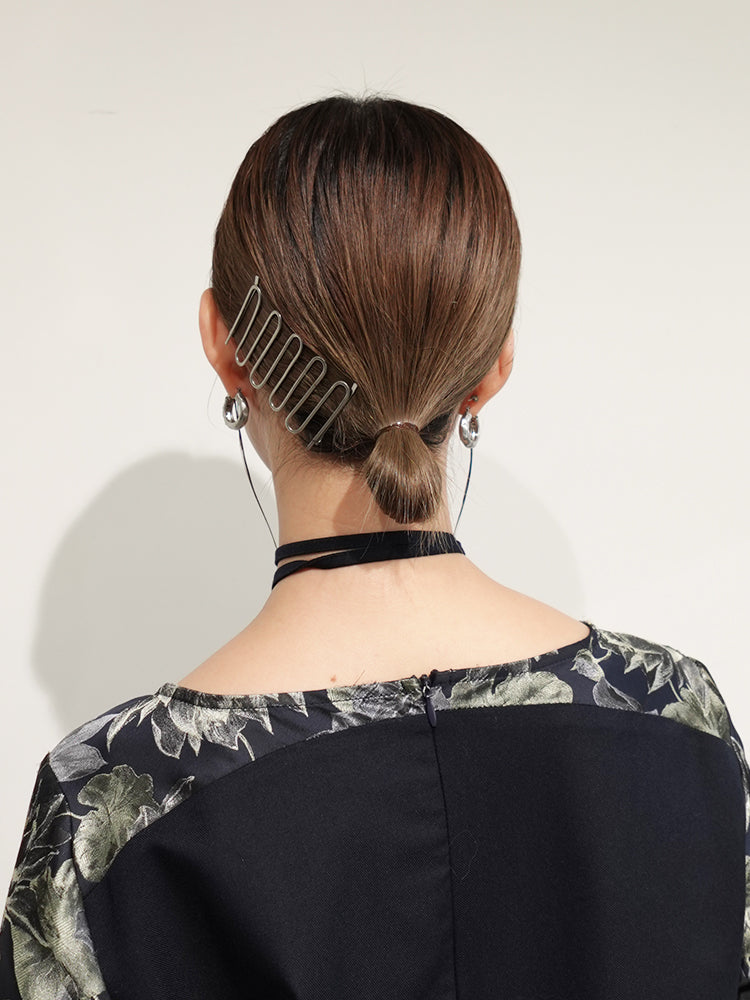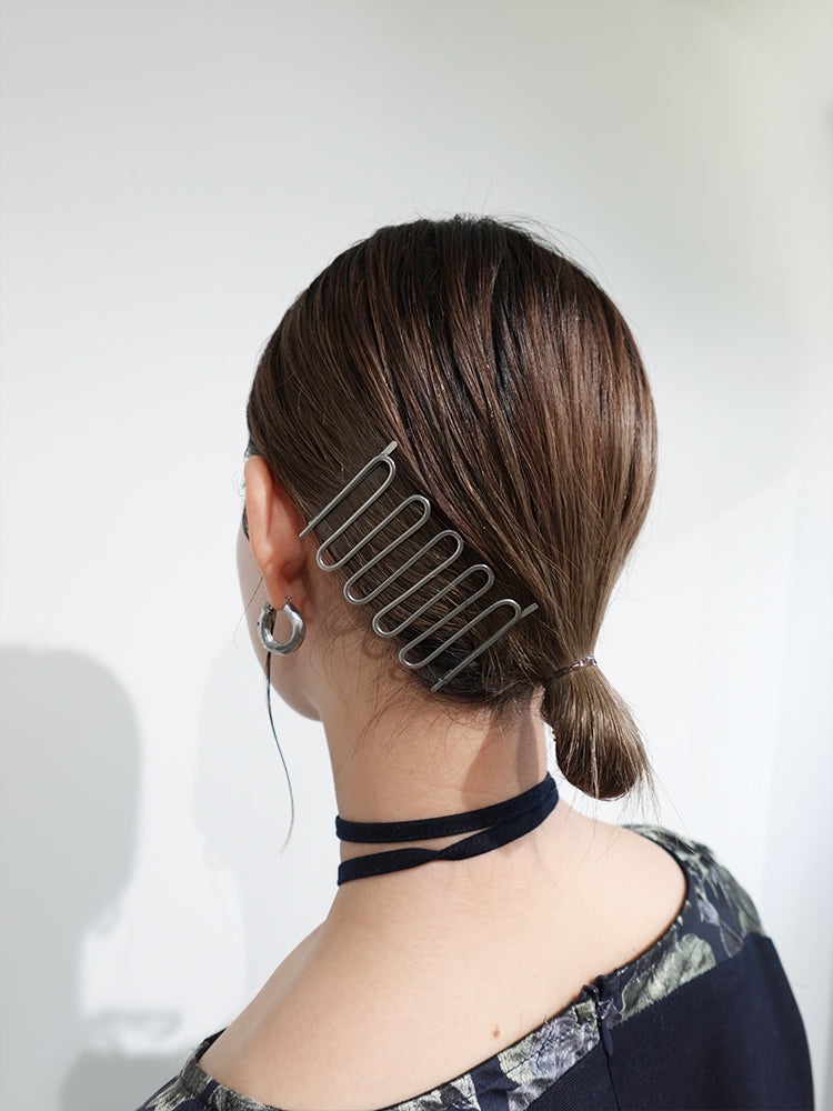 - サイドにWave Hair Wire Pinをつけて完成。耳より少し下につけると上品な印象に。