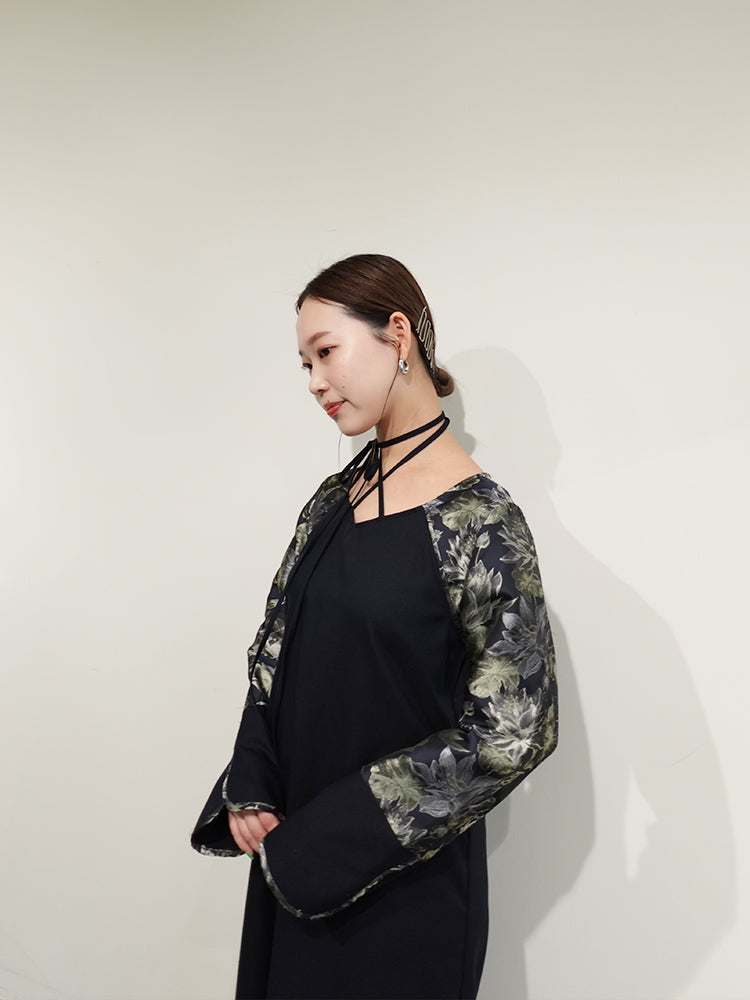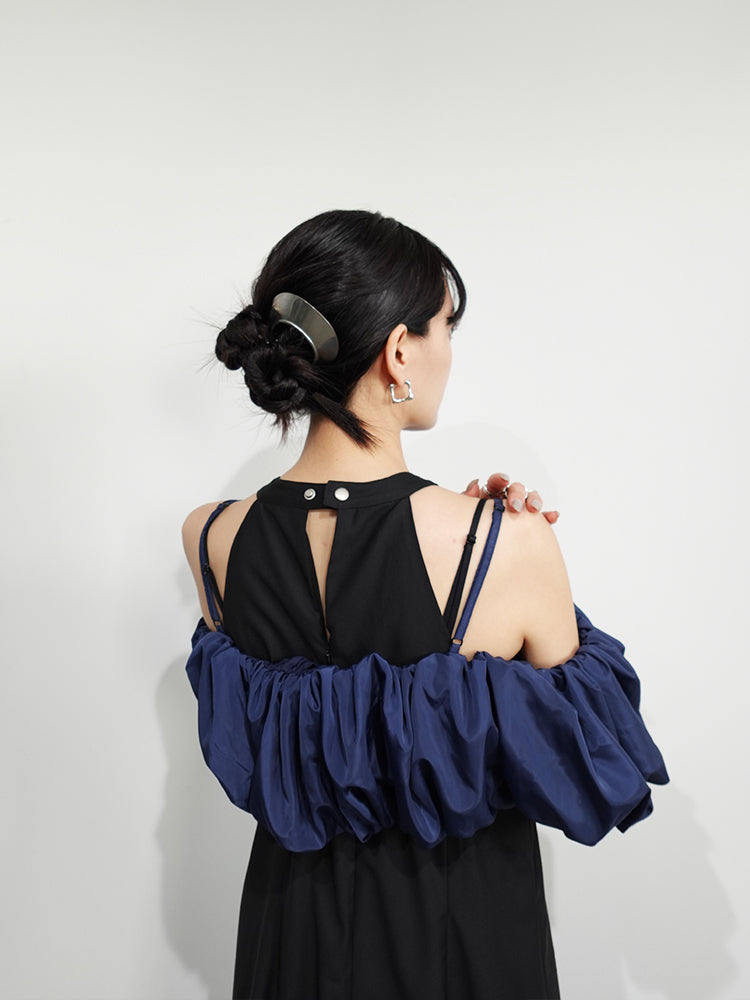 シルバーのアクセサリーと、袖の装飾の色合いがマッチ。華やかで洗練された印象に。