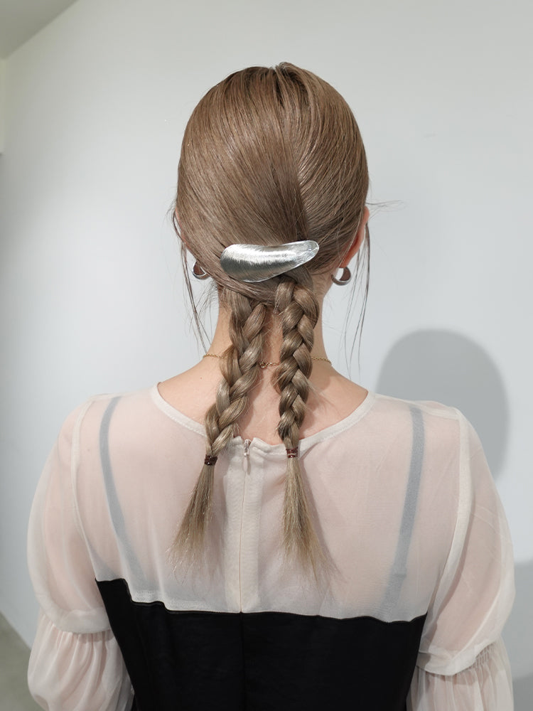 - 二つの三つ編みができたら真ん中にバレッタをつけます。髪の毛を広いすぎると表面の髪の毛の毛流れが崩れてしますので、表面だけ拾ってつけるのがおすすめです。