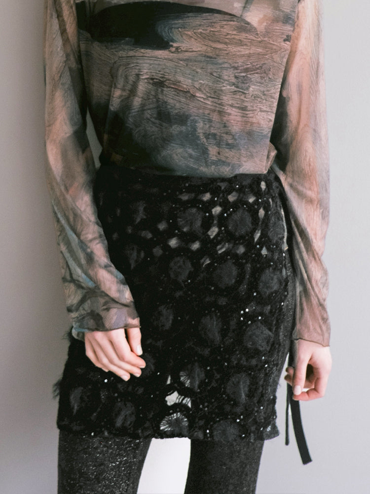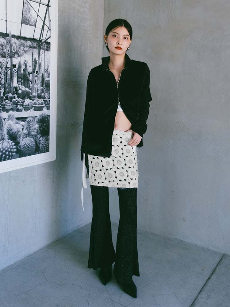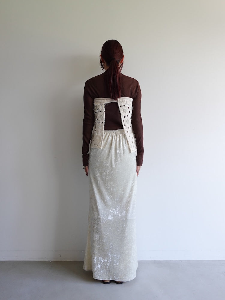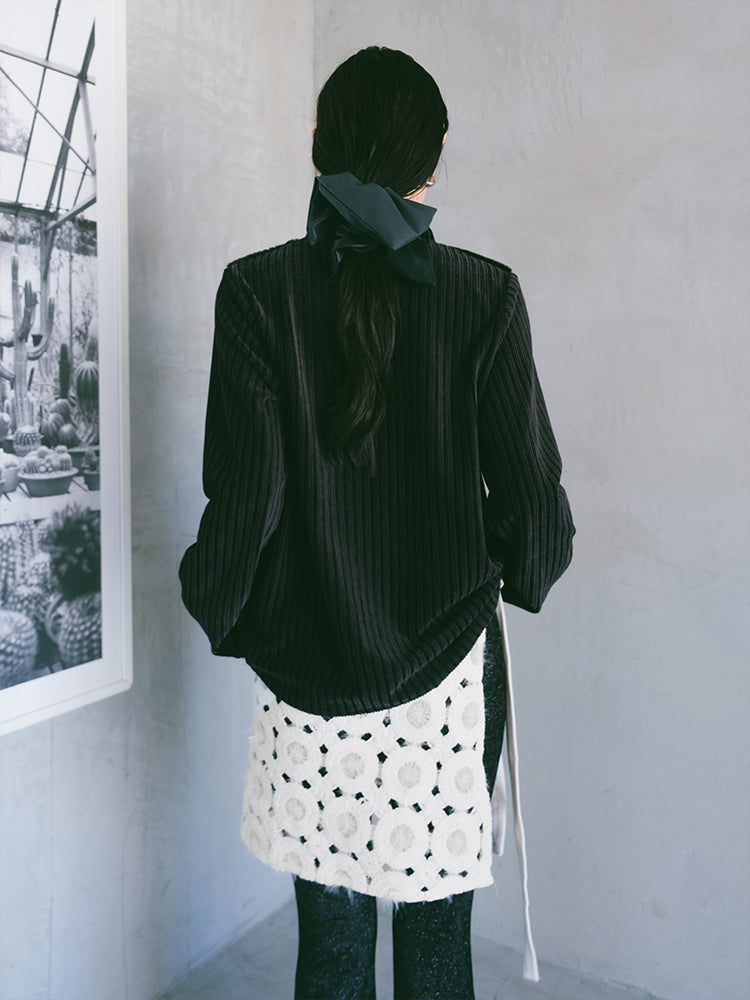ふわふわとした立体的なテクスチャーが印象的で、秋冬のスタイリングにぴったり。リボンで結ぶタイプなのでウエスト調整もしやすく、太もも中間くらいの丈感でバランスが取りやすいです。繊細な素材なので引っかけには少し注意が必要だなと思いました。