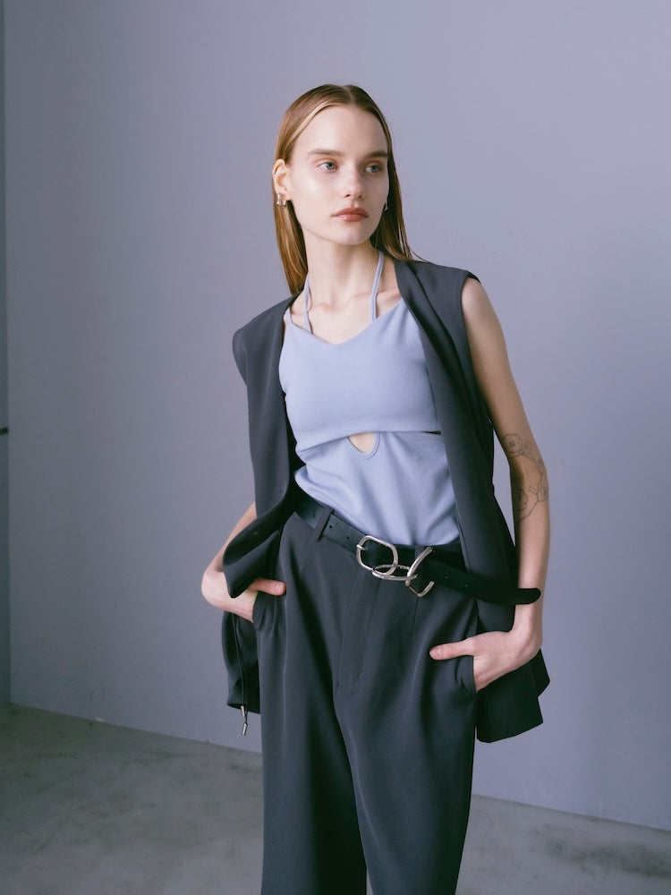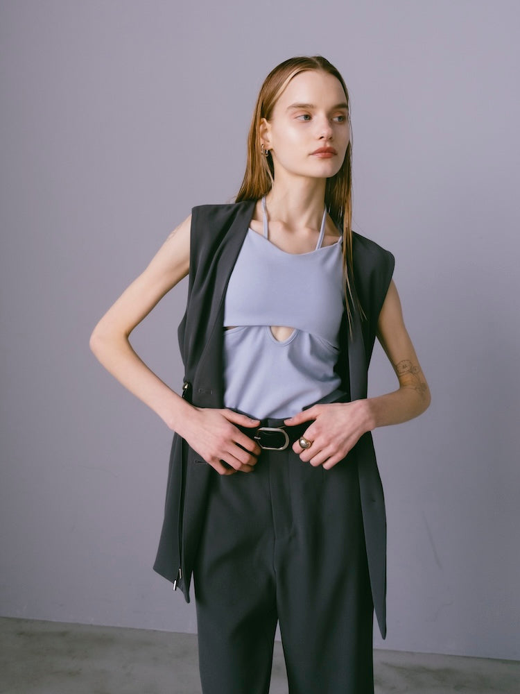 すっきりとしたVネックラインと、フロントの2つボタンがミニマルで都会的な印象。