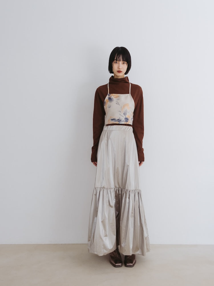 モードさと華やかさが漂い、シンプルなデザインながらも存在感を放つティアードスカート。