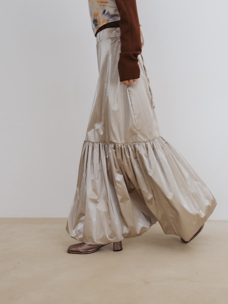 腰まわりはすっきりとしたフラット仕様で、膝上から裾にかけて大胆なギャザー切り替えを施しています。