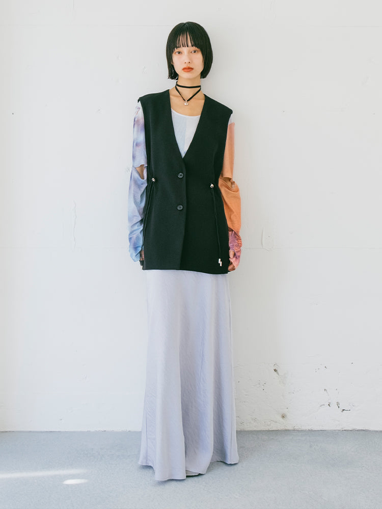 身体に自然と添うセミタイトなシルエット。ウエストは後ろ部分のみゴム仕様となっており、フロントはすっきりとした印象に。