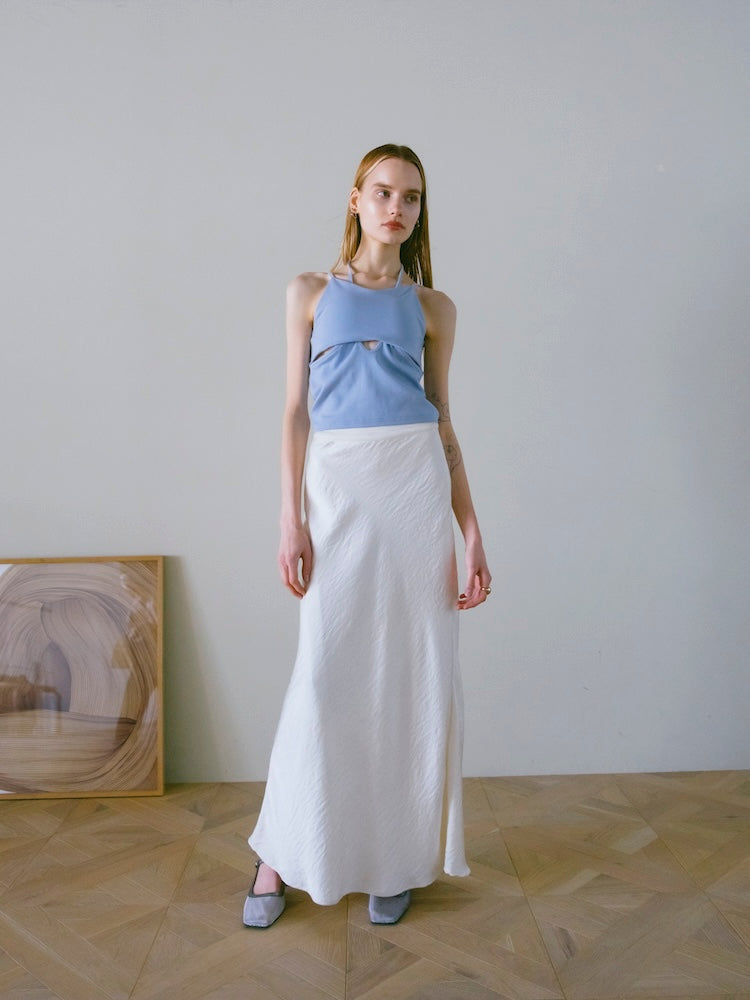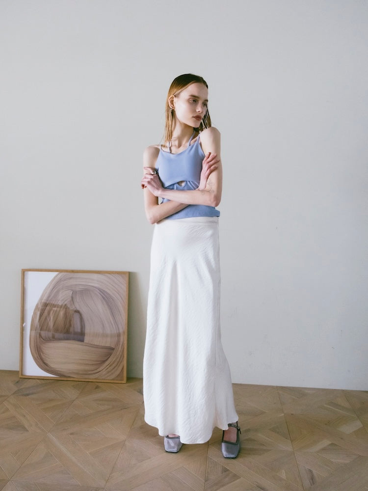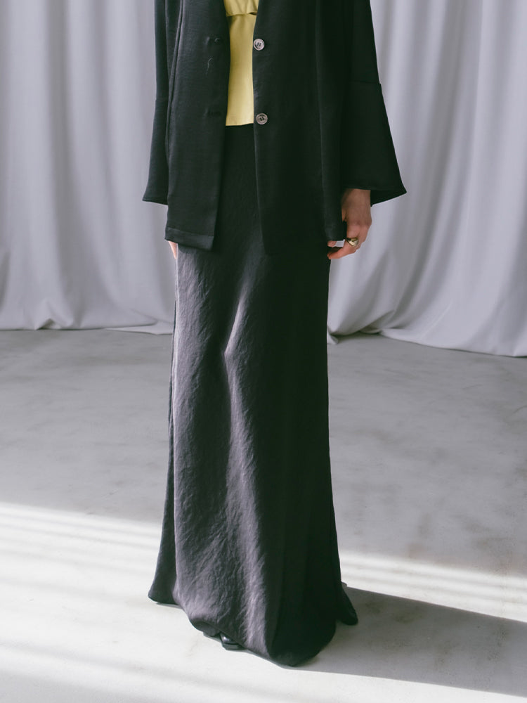 サテン生地の艶感がとても綺麗で、履き心地抜群のスカート。シンプルで上品なので、1枚あると必ず使えます!Sサイズでかかとくらいの丈なので、低身長の方でも安心して着用いただけます。