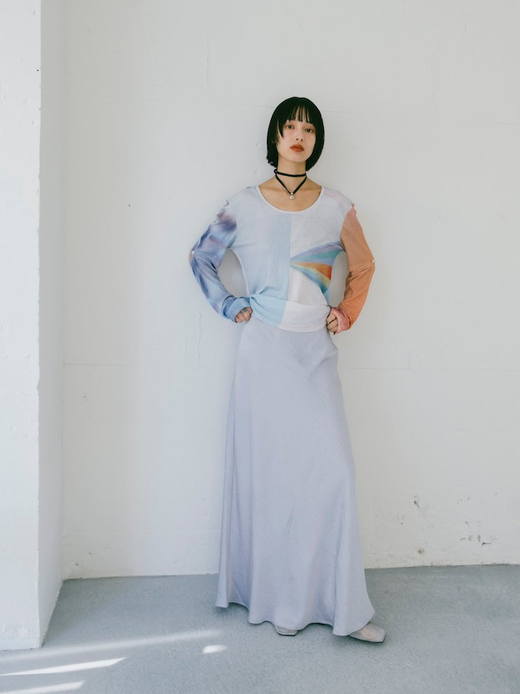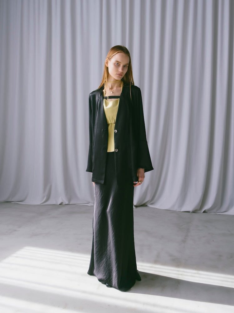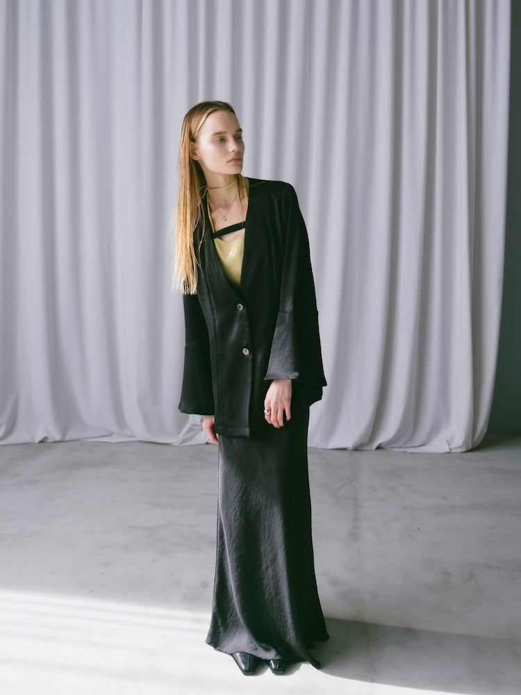 落ち感のある滑らかで上品な印象のマットサテン素材を使用。 程よい光沢感はリラクシーな雰囲気を醸し出しデイリーにもオケージョンシーンにも重宝する一着です。